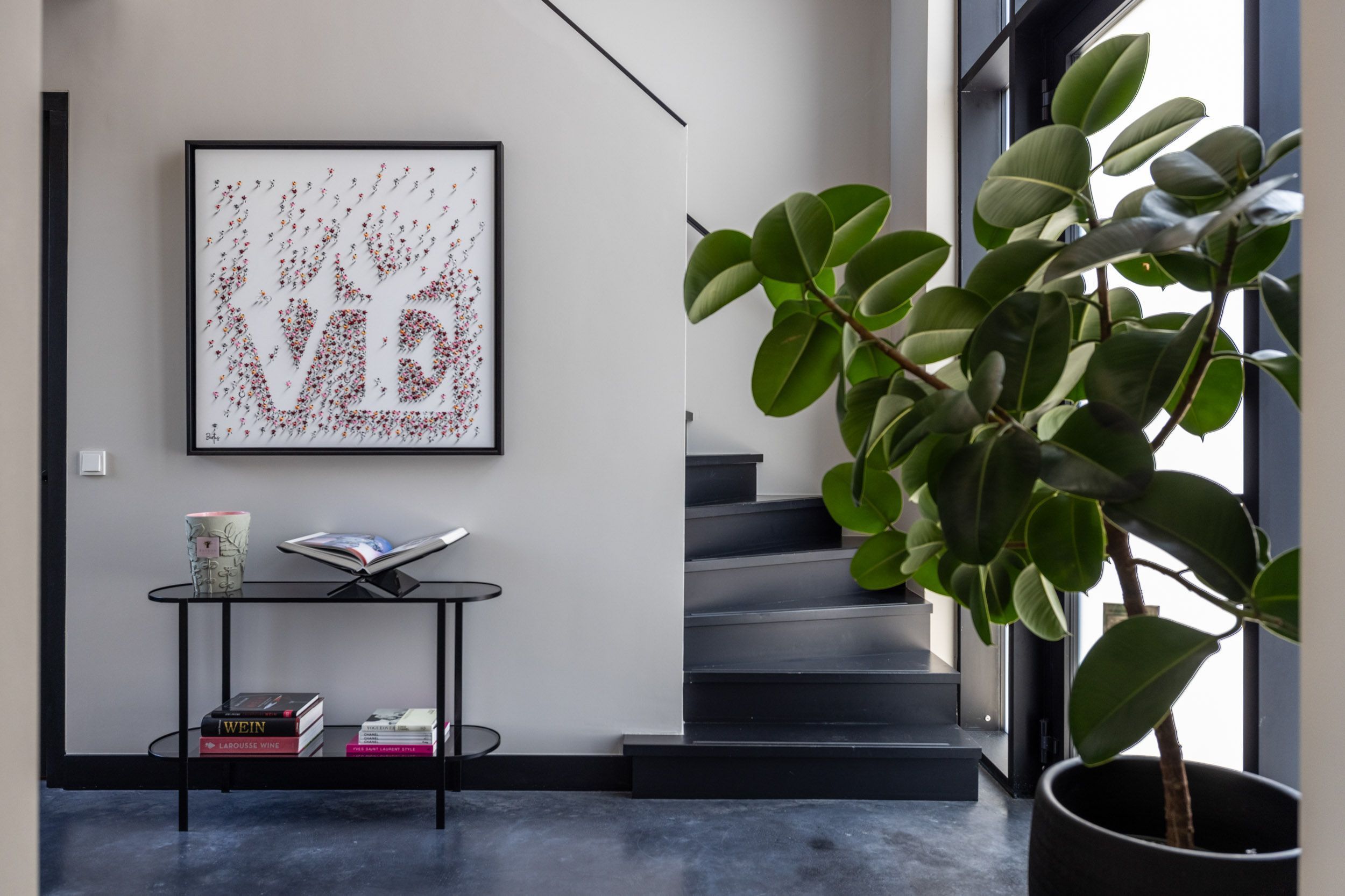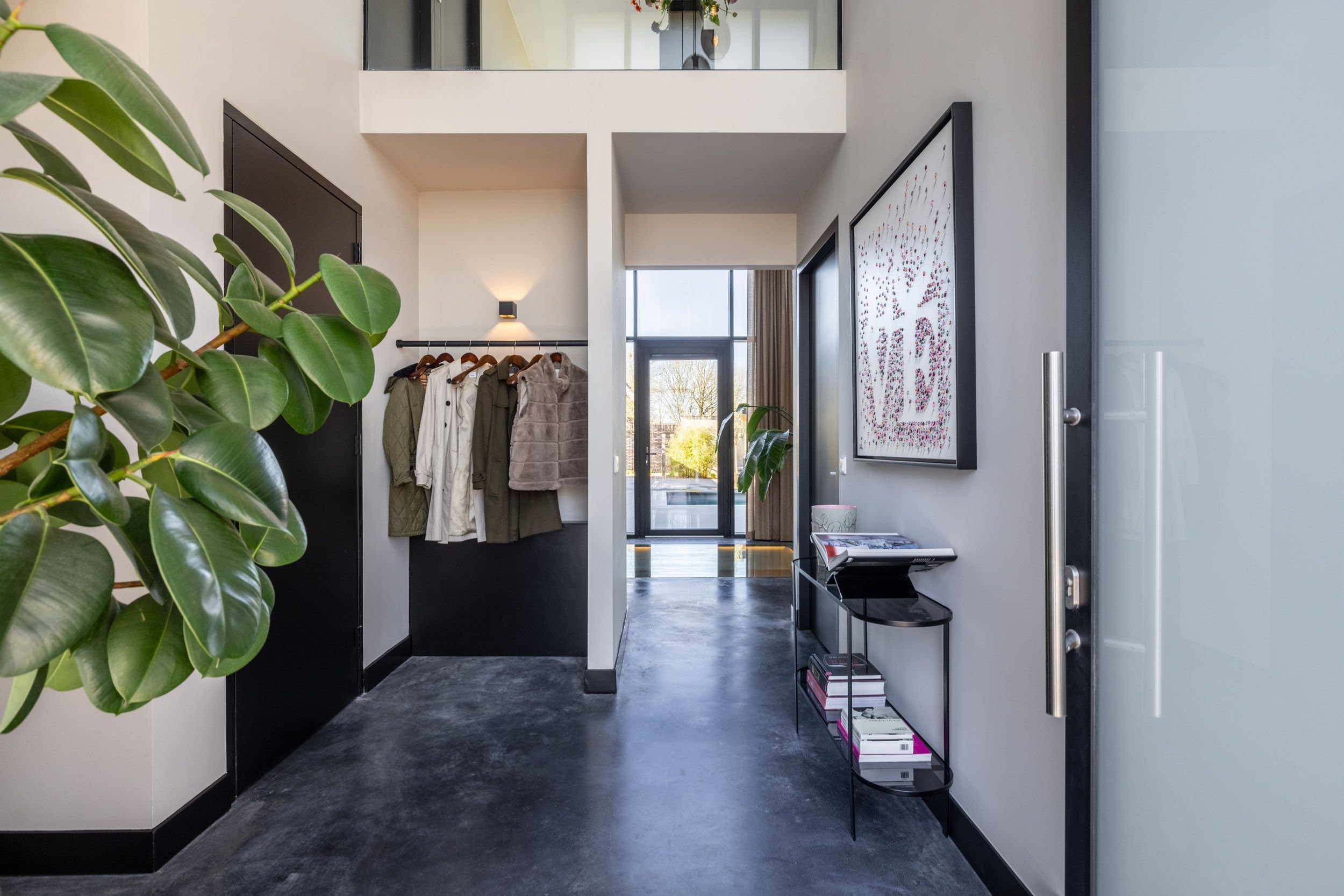 De entree van de villa maakt direct indruk. De riante ontvangsthal met vide creëert een gevoel van ruimte en elegantie, waarbij de monolithisch afgewerkte betonvloer – naadloos uitgevoerd over de gehele begane grond – een krachtige en stijlvolle basis vormt voor het interieur. De garderobe is subtiel geïntegreerd en vanuit de hal ontvouwt zich de leefruimte van de woning.