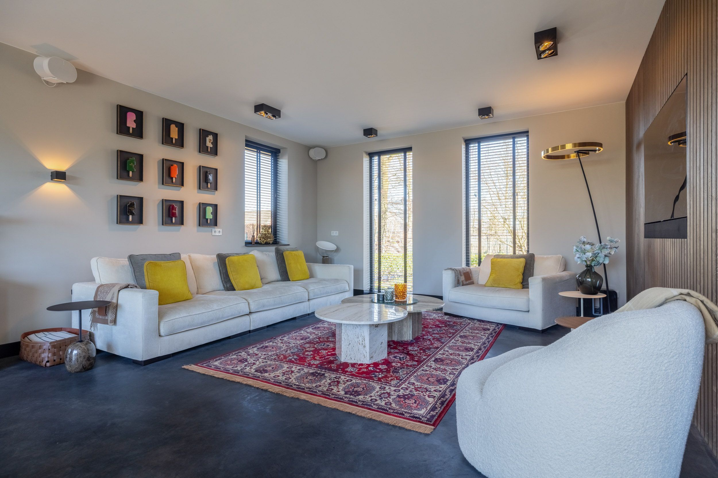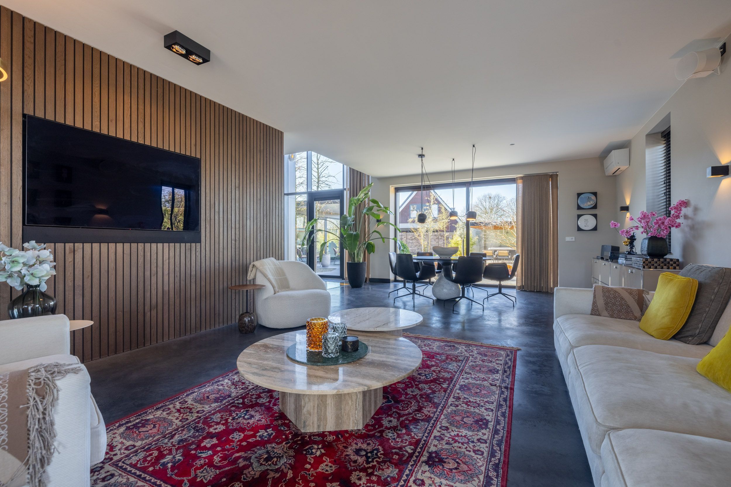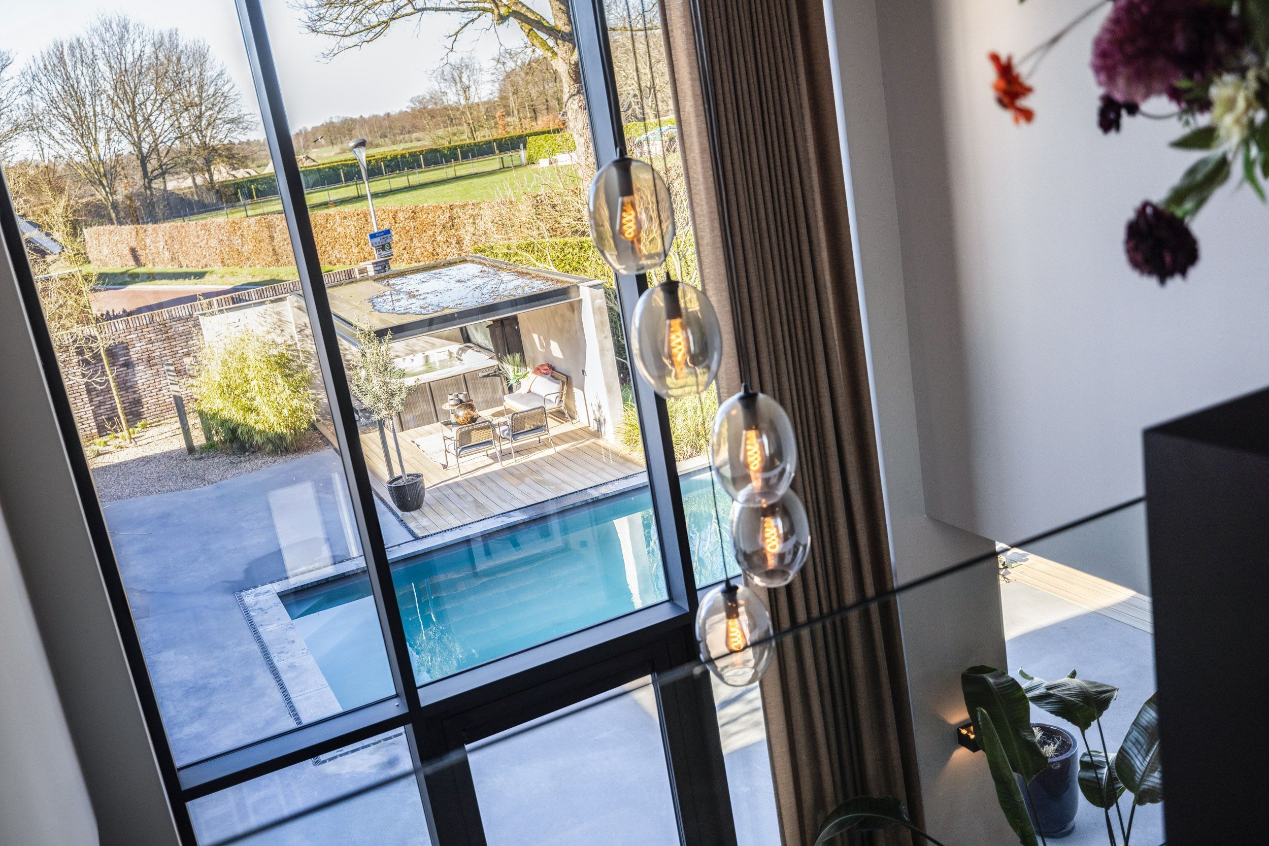 De royale L-vormige woonkamer kenmerkt zich door haar lichte en open karakter. Grote raampartijen tot aan de vloer bieden een prachtig zicht op de onder architectuur aangelegde tuin en het zwembad en zorgen voor optimale daglichttoetreding. Verfijnde details, zoals elektrisch bedienbare rolgordijnen en een warme notenhouten wand-afwerking, versterken de exclusieve uitstraling van deze leefruimte.