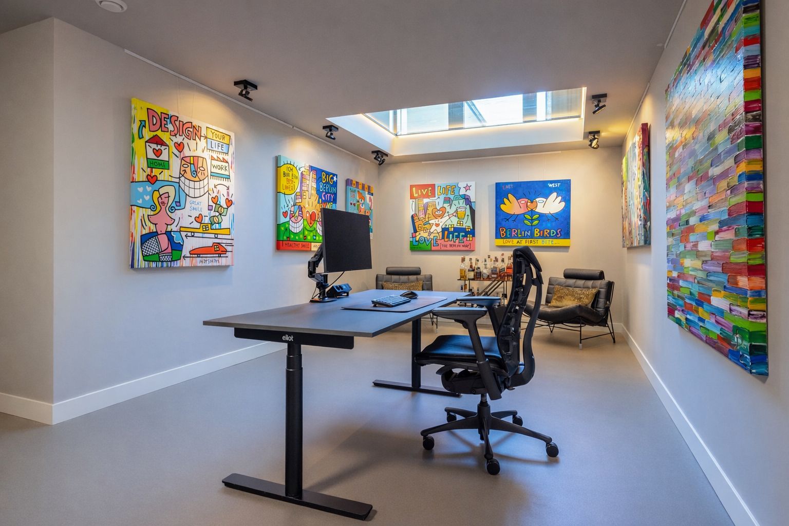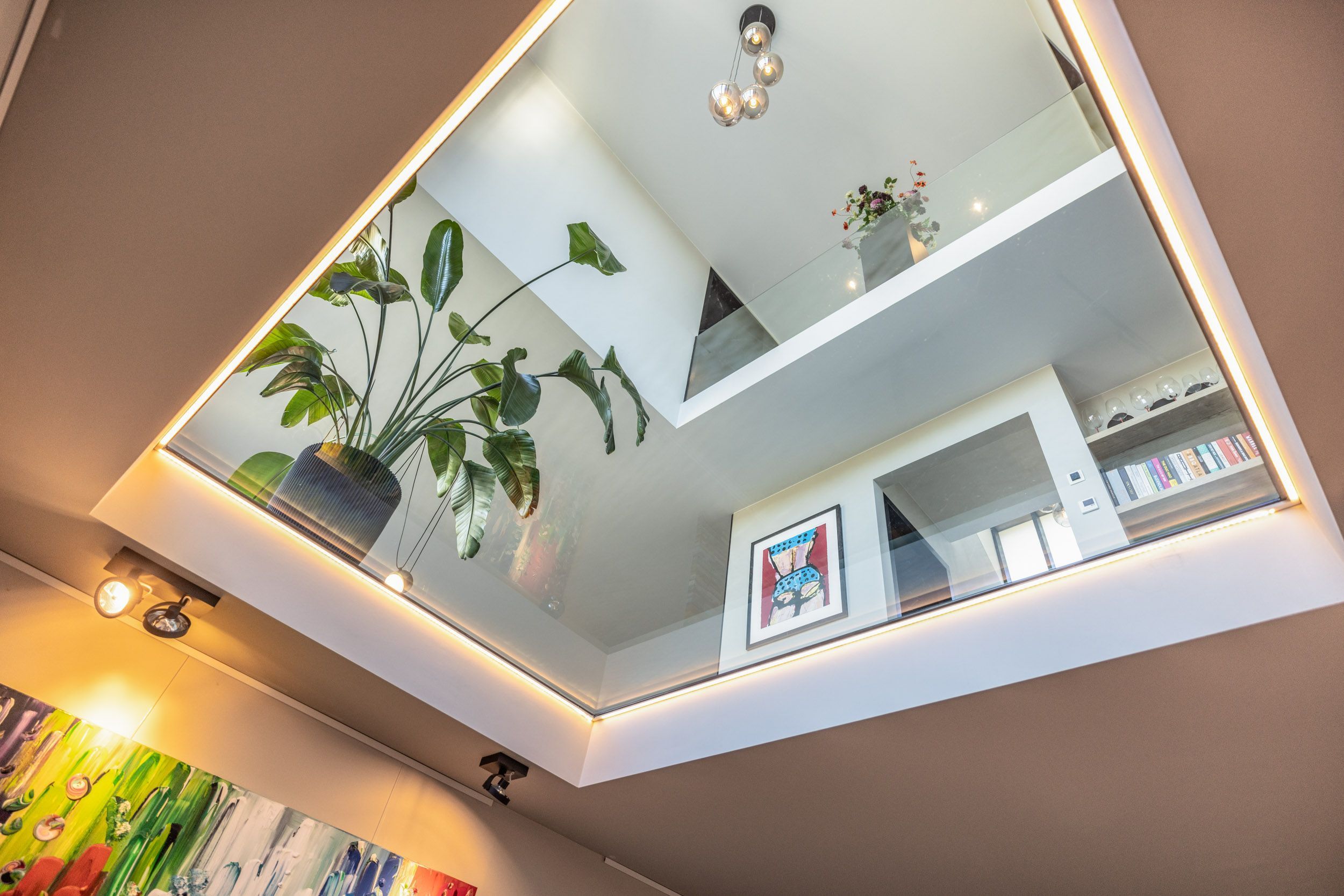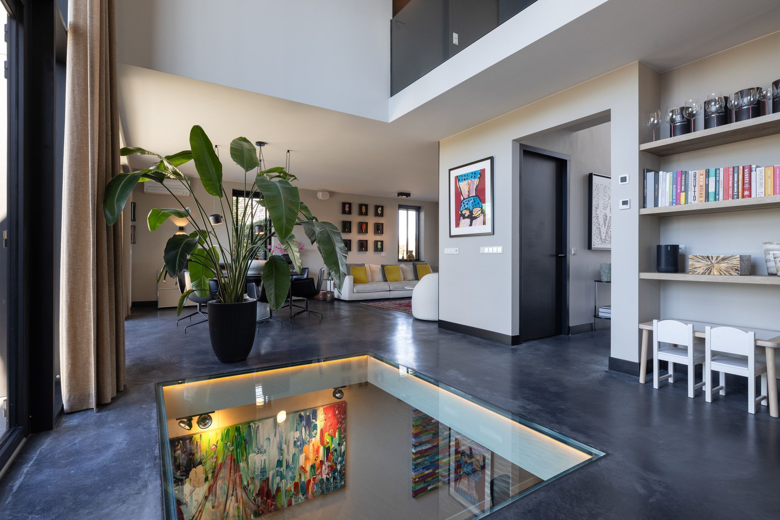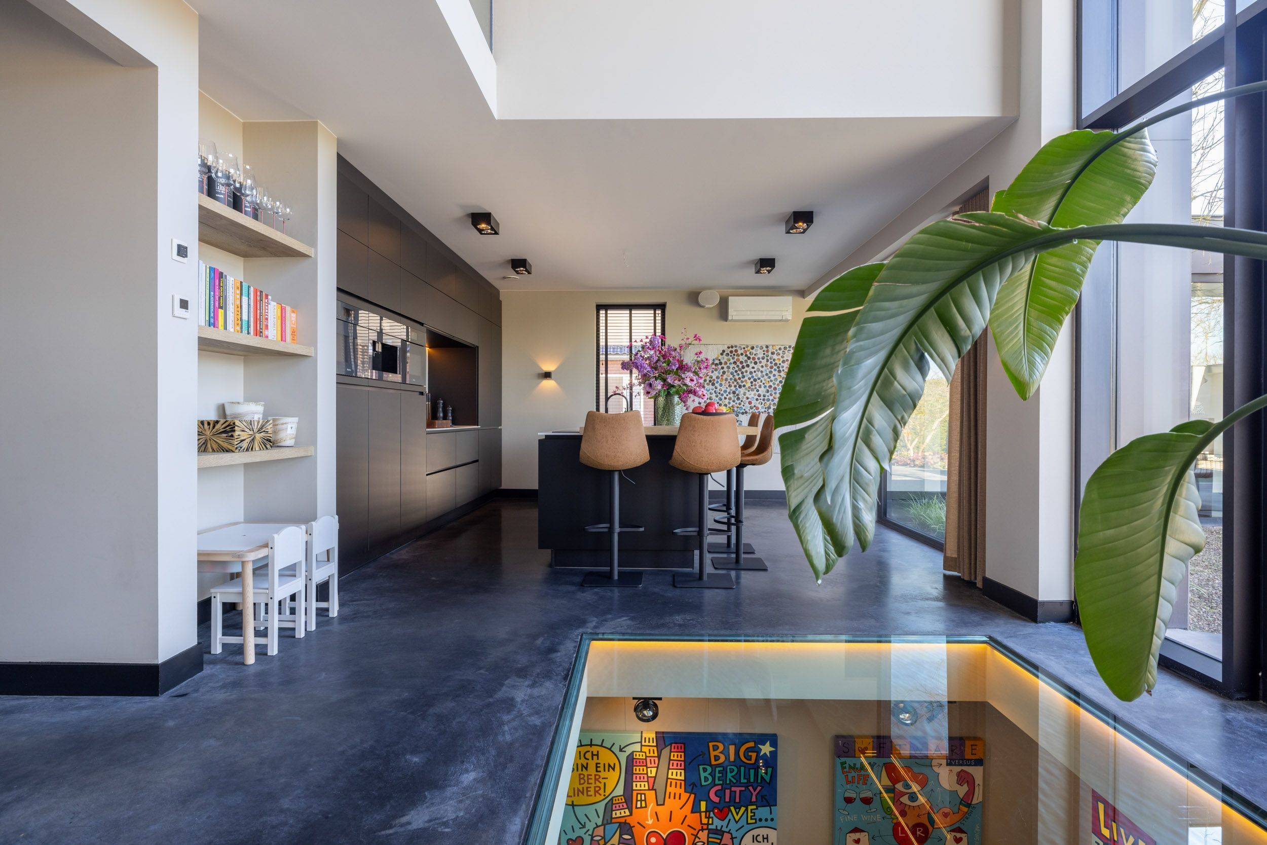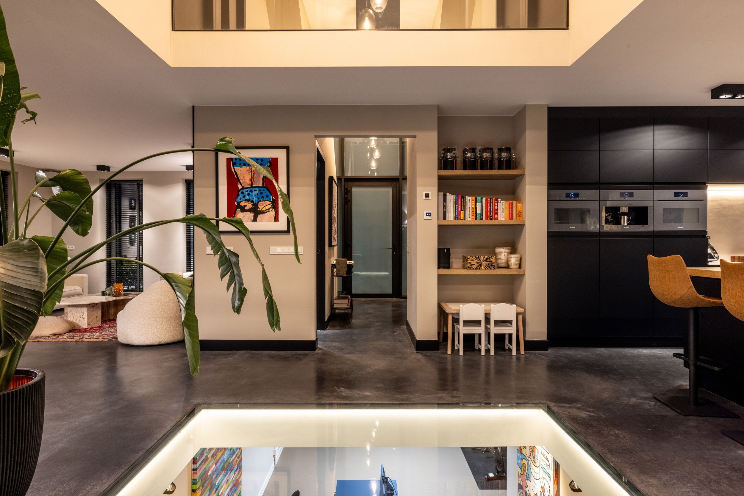 Momenteel wordt deze ruimte gebruikt als extra werkkamer. Het glazen plafond – zichtbaar vanuit de woonkamer en leefkeuken – zorgt voor een bijzondere visuele verbinding tussen het souterrain en de leefruimte erboven.