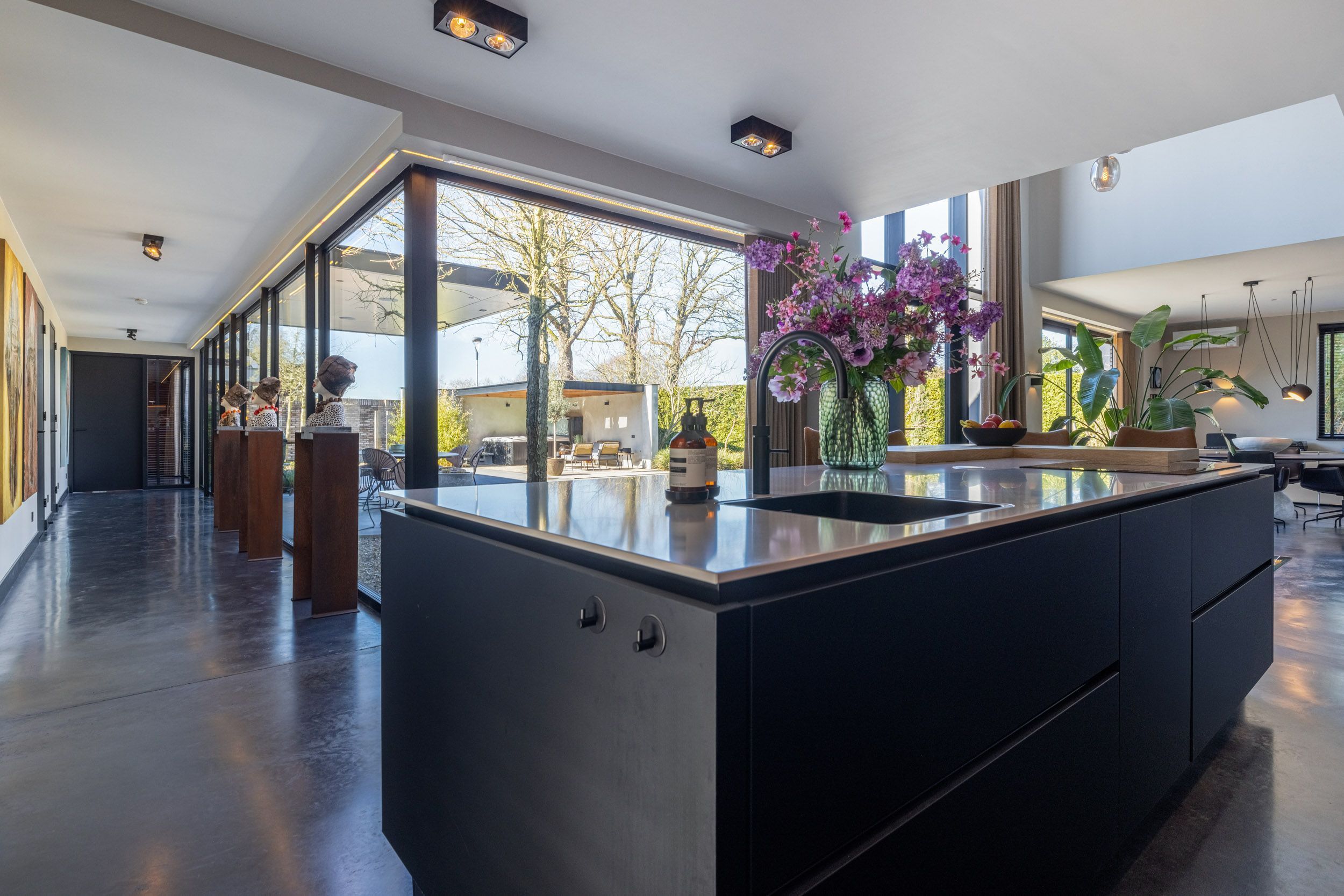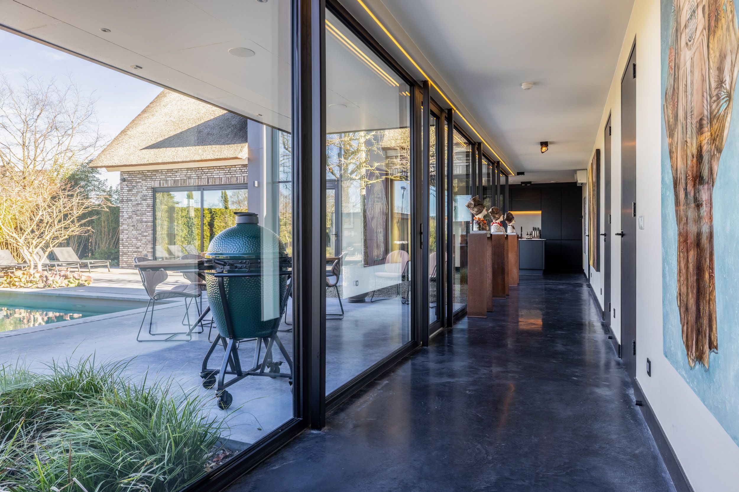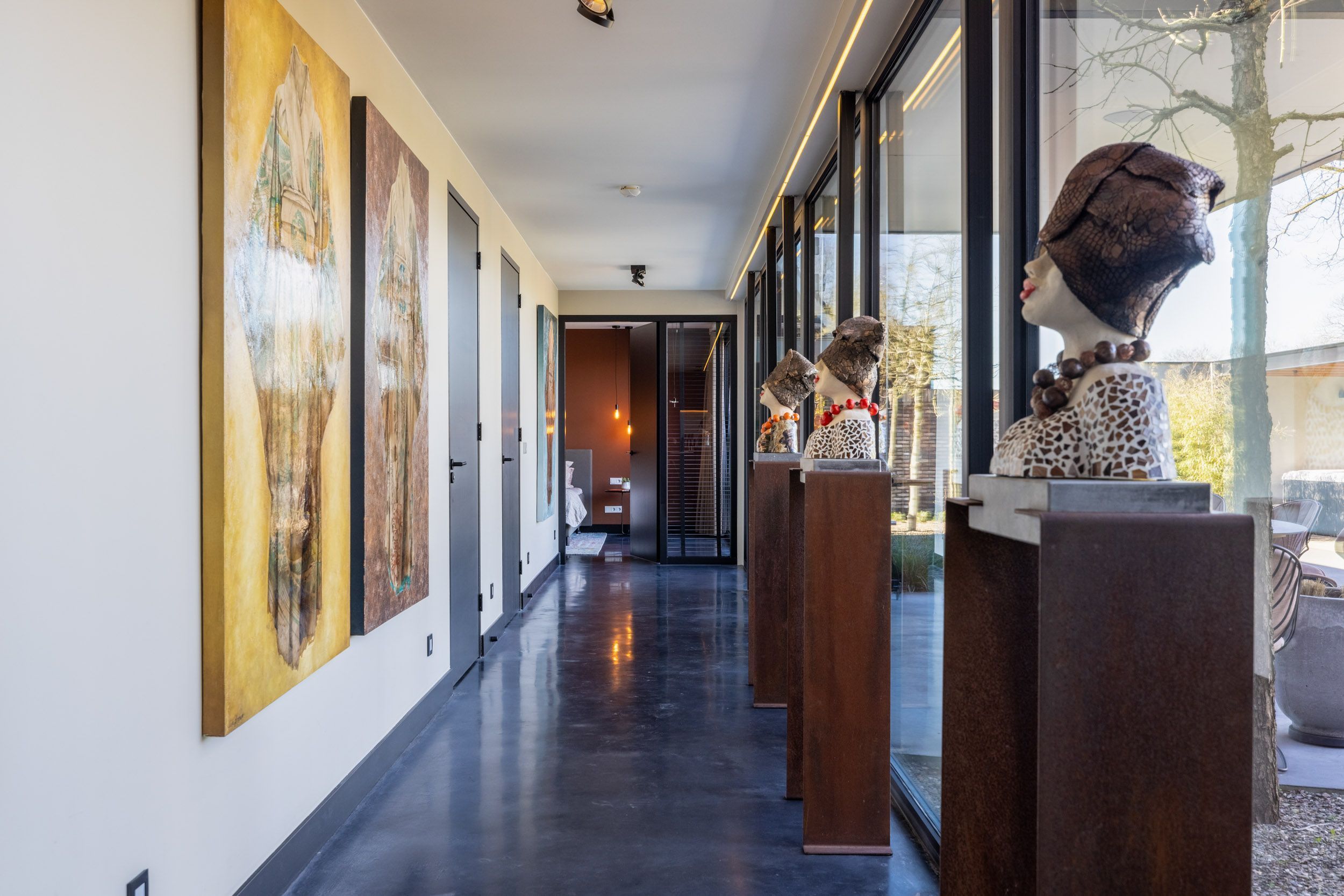 Aansluitend bevindt zich een circa 11 meter lange gang met een indrukwekkende plafondhoge raampartij en subtiele avondverlichting. Deze gang geeft toegang tot de slaapvleugel, de waskamer en het gastentoilet.