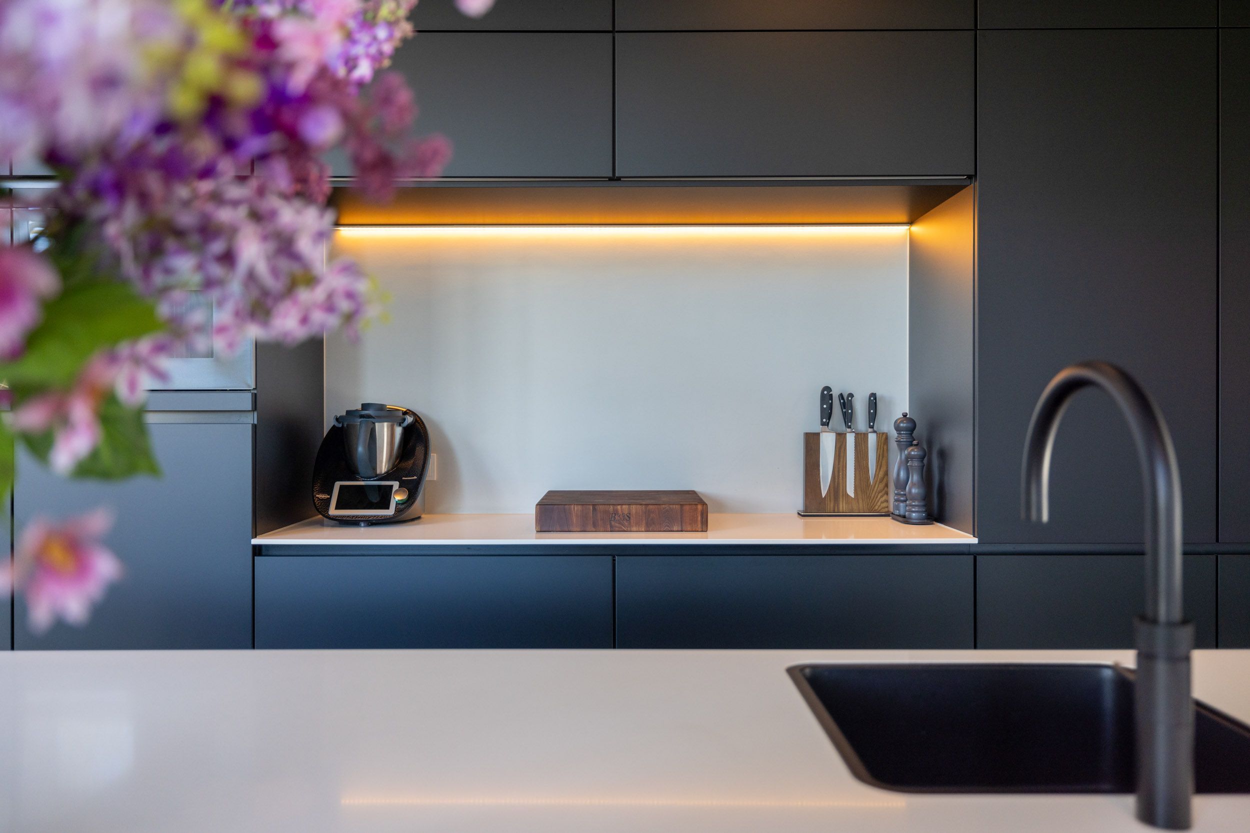 Hoogwaardige premium inbouwapparatuur – waaronder een wijnklimaatkast, koffieapparaat, oven/stoomoven, magnetron/oven en ruime koel- en vriescombinaties – garanderen optimaal gebruiksgemak. Het composiet werkblad, de greeploze kasten en de royale hoeveelheid bergruimte onderstrepen het verfijnde en exclusieve afwerkingsniveau.