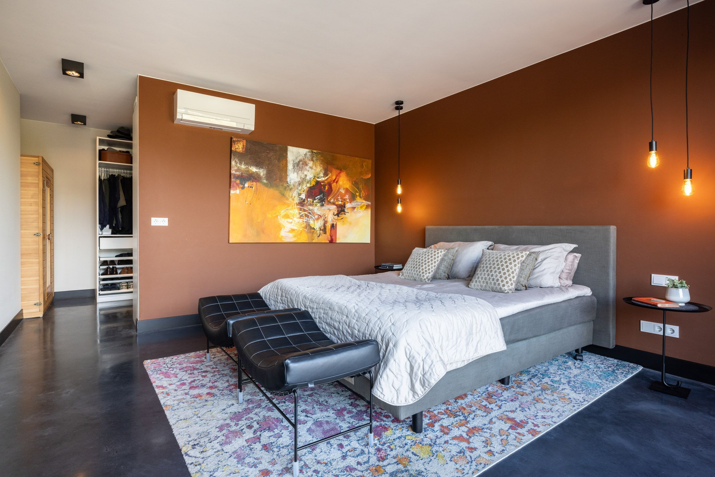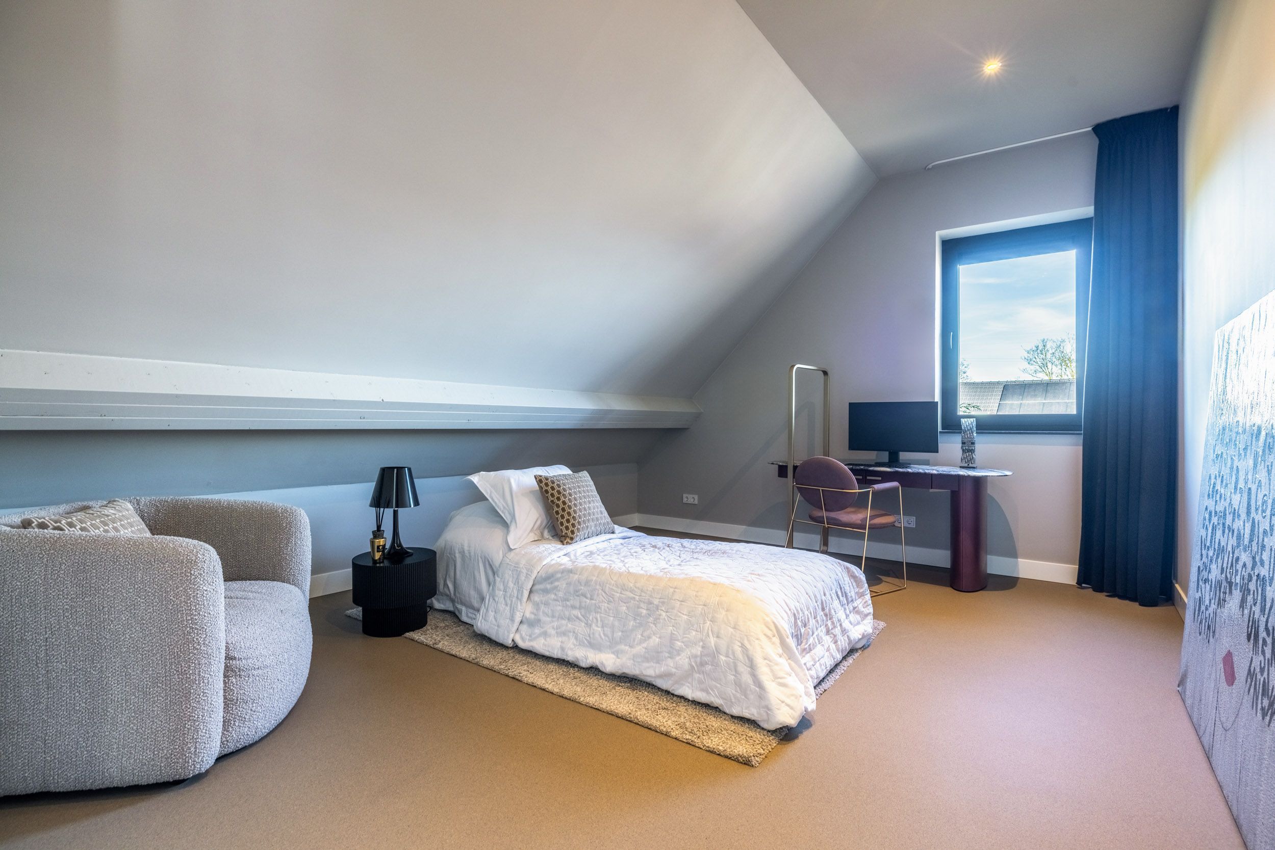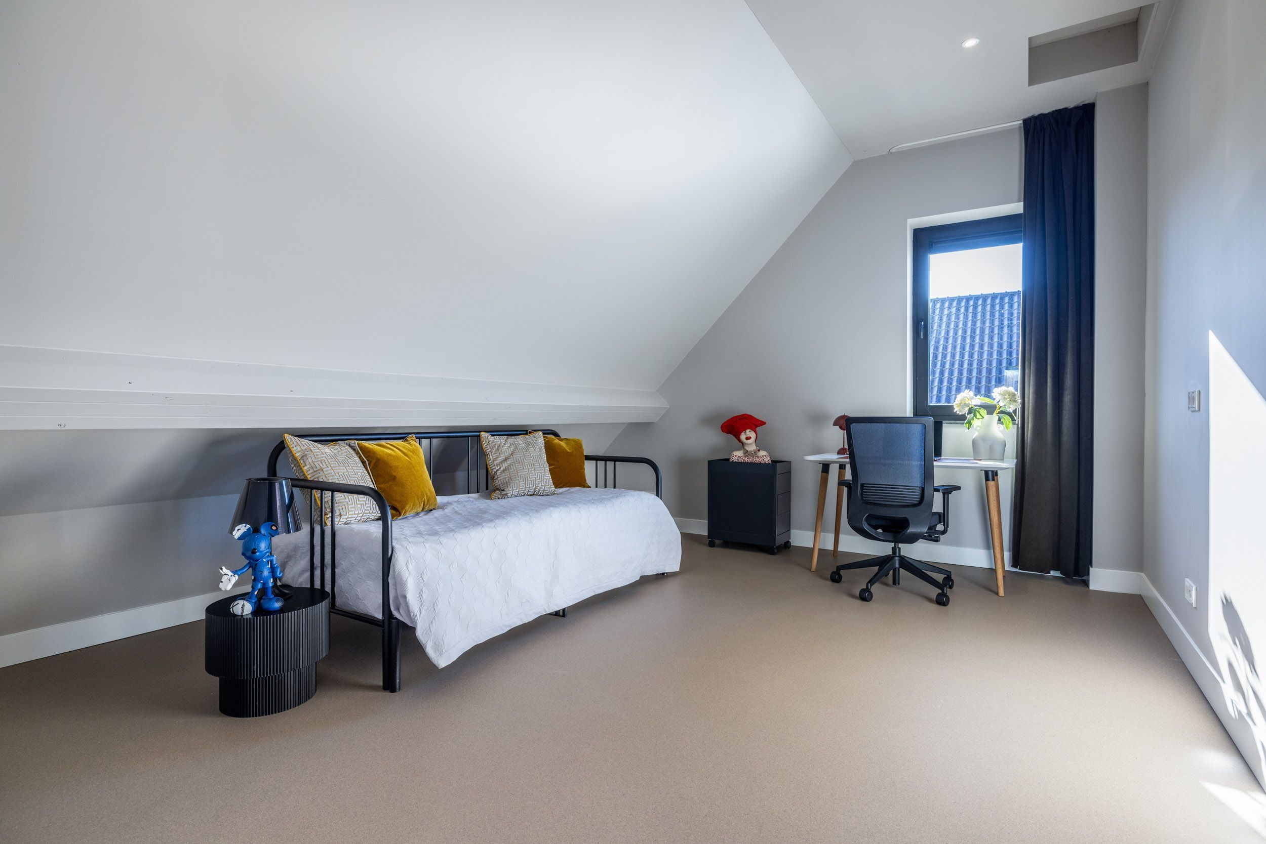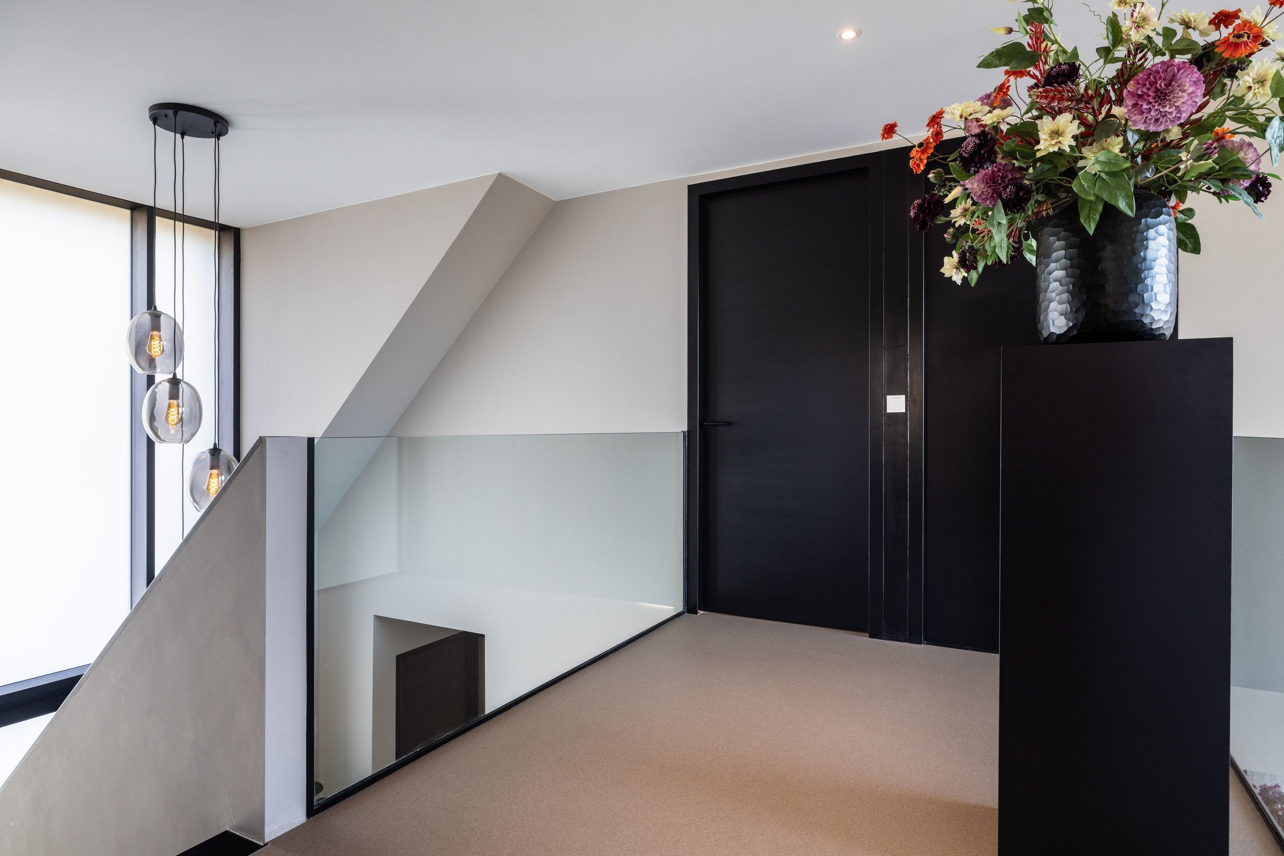 Via de steektrap in de open vide wordt de eerste verdieping bereikt, waarbij de ruimtelijkheid van de woning direct voelbaar blijft. Hier bevinden zich drie comfortabele slaapkamers, elk afgewerkt met hoogwaardige materialen zoals maatwerkkasten en een strakke troffelvloer.