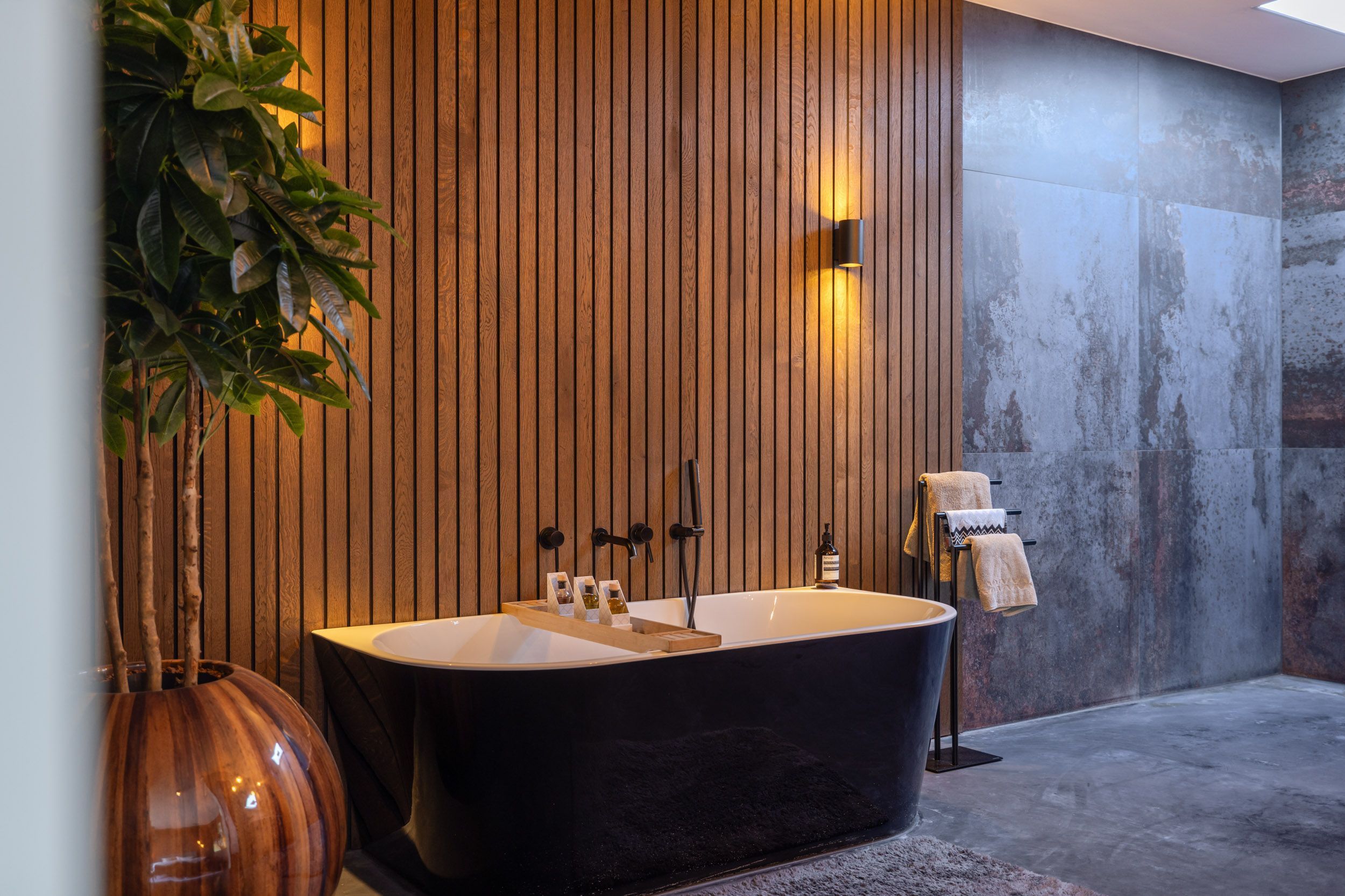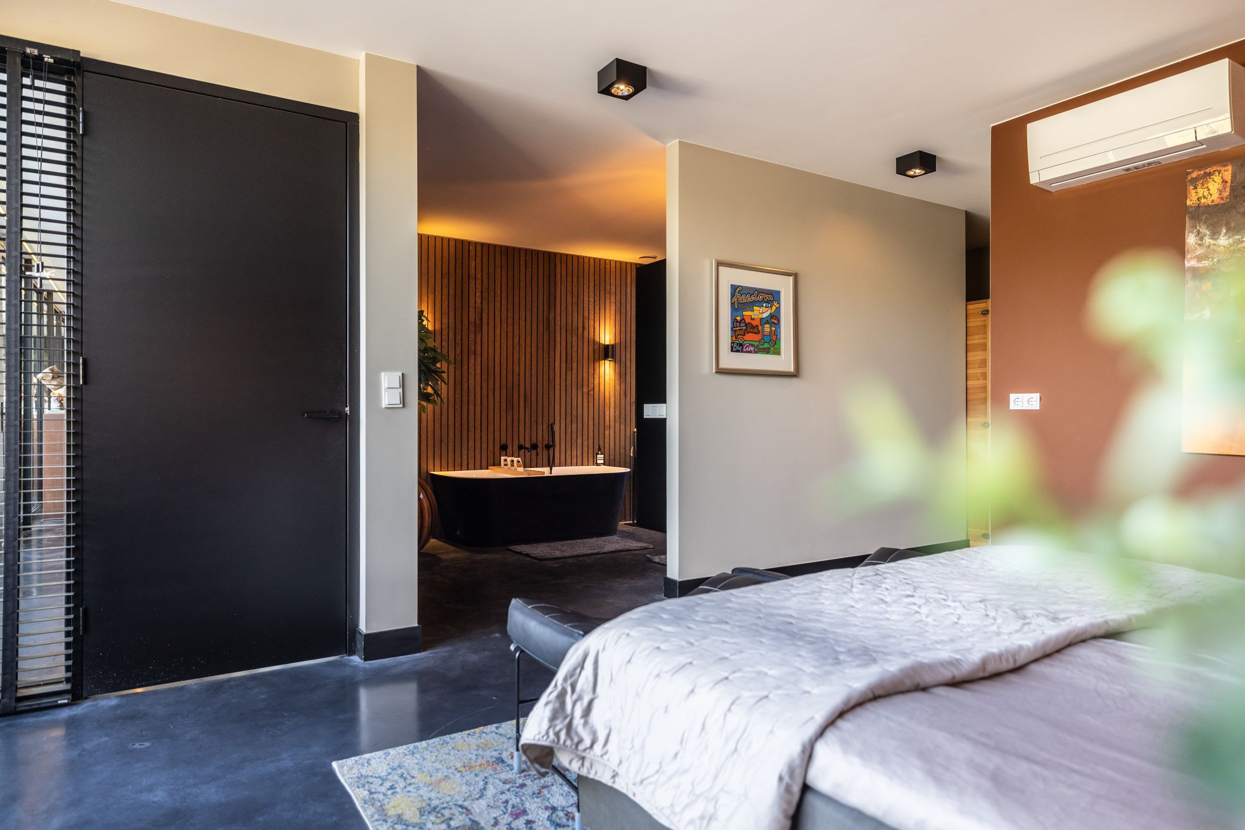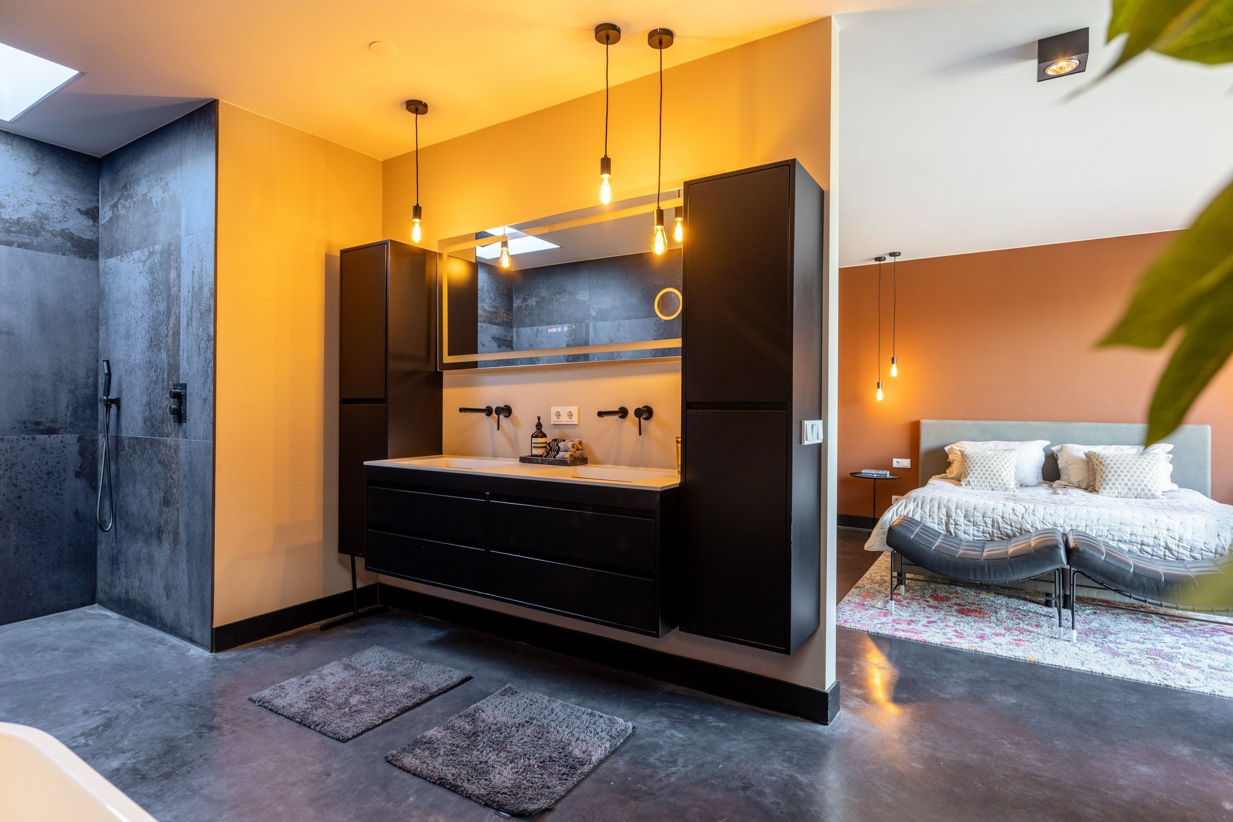 Op de begane grond bevindt zich de privé-slaapsuite van de villa: een royale hoofdslaapkamer met een eigen luxe badkamer én tweepersoons infraroodsauna. De badkamer is ingericht als een comfortabele wellnessruimte en beschikt over een ligbad, een meer dan ruime inloopdouche en een maatwerk wastafelmeubel.
