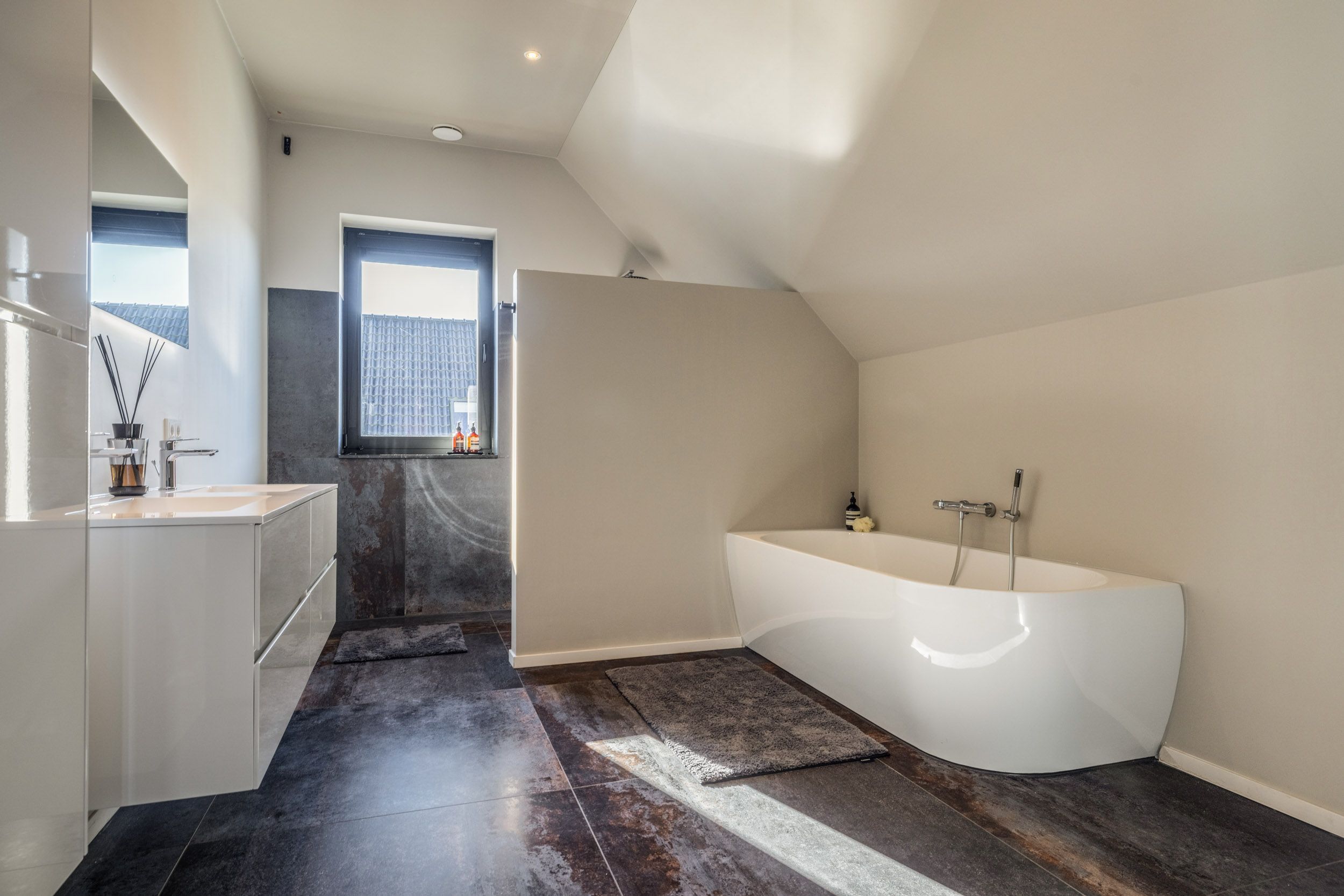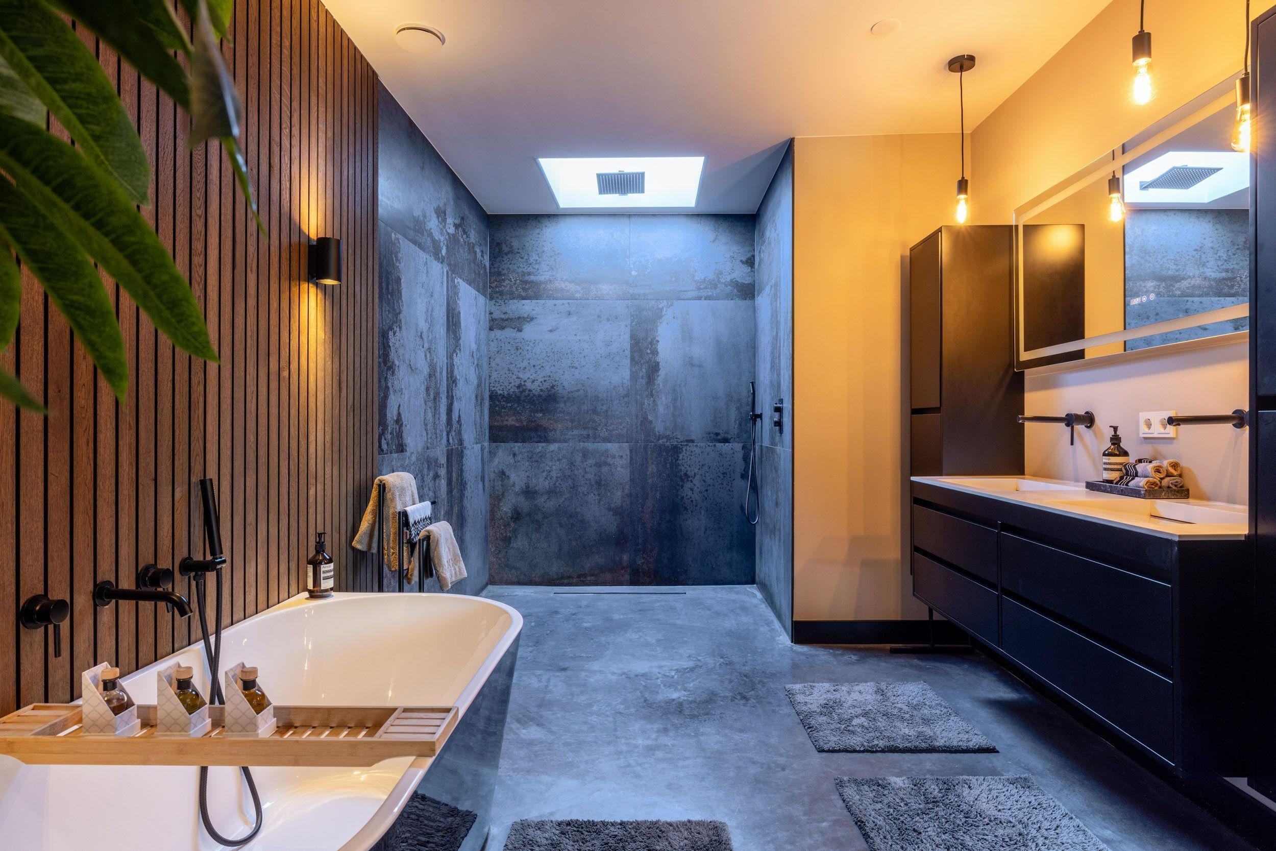 De tweede badkamer is eveneens zeer royaal opgezet en uitgerust met een ligbad, een ruime inloop(regen)douche en een dubbel wastafelmeubel. Via het geïntegreerde Sonos-audiosysteem kan ook hier eenvoudig muziek worden afgespeeld.
