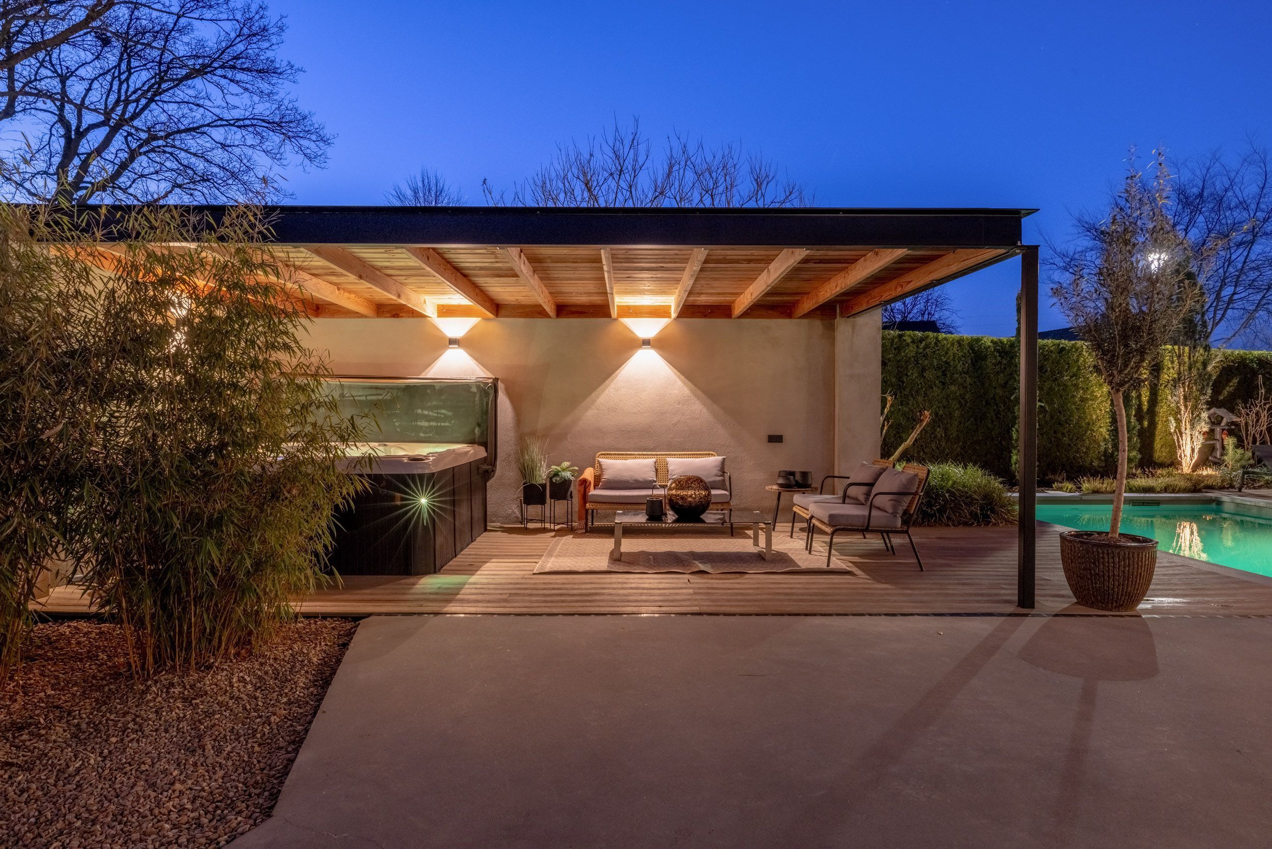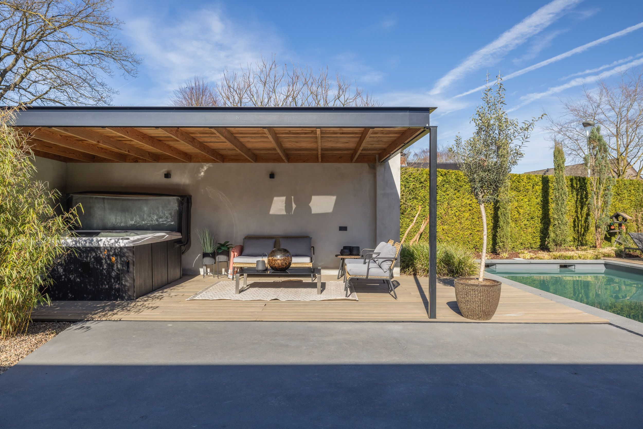 Grenzend aan de woning bevindt zich een royaal monolithisch terras met overkapping, voorzien van ingebouwde speakers en aansluitingen voor elektra en internet. Daarnaast beschikt de tuin over een tweede terras met een Douglas-houten overkapping en een jacuzzi.
