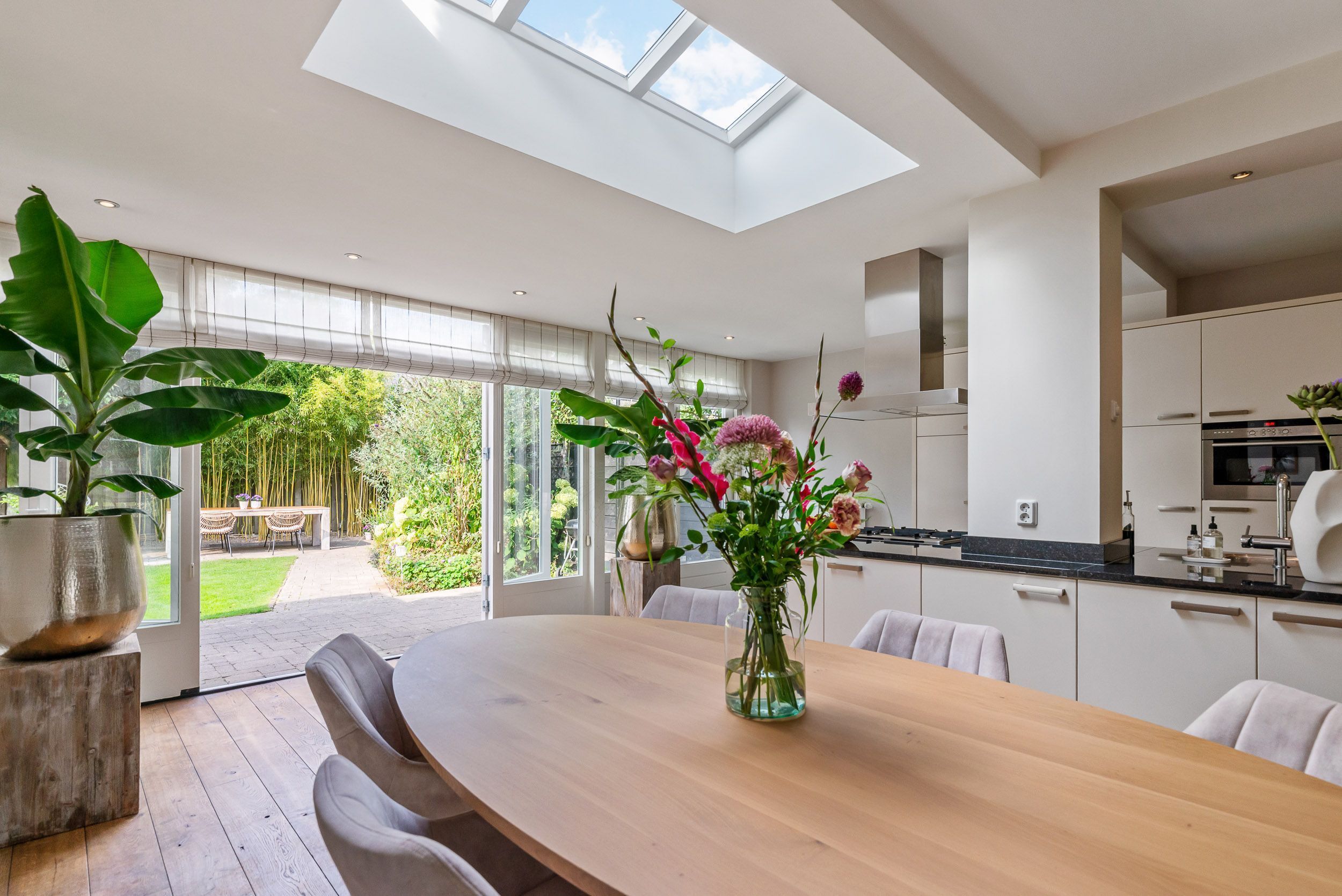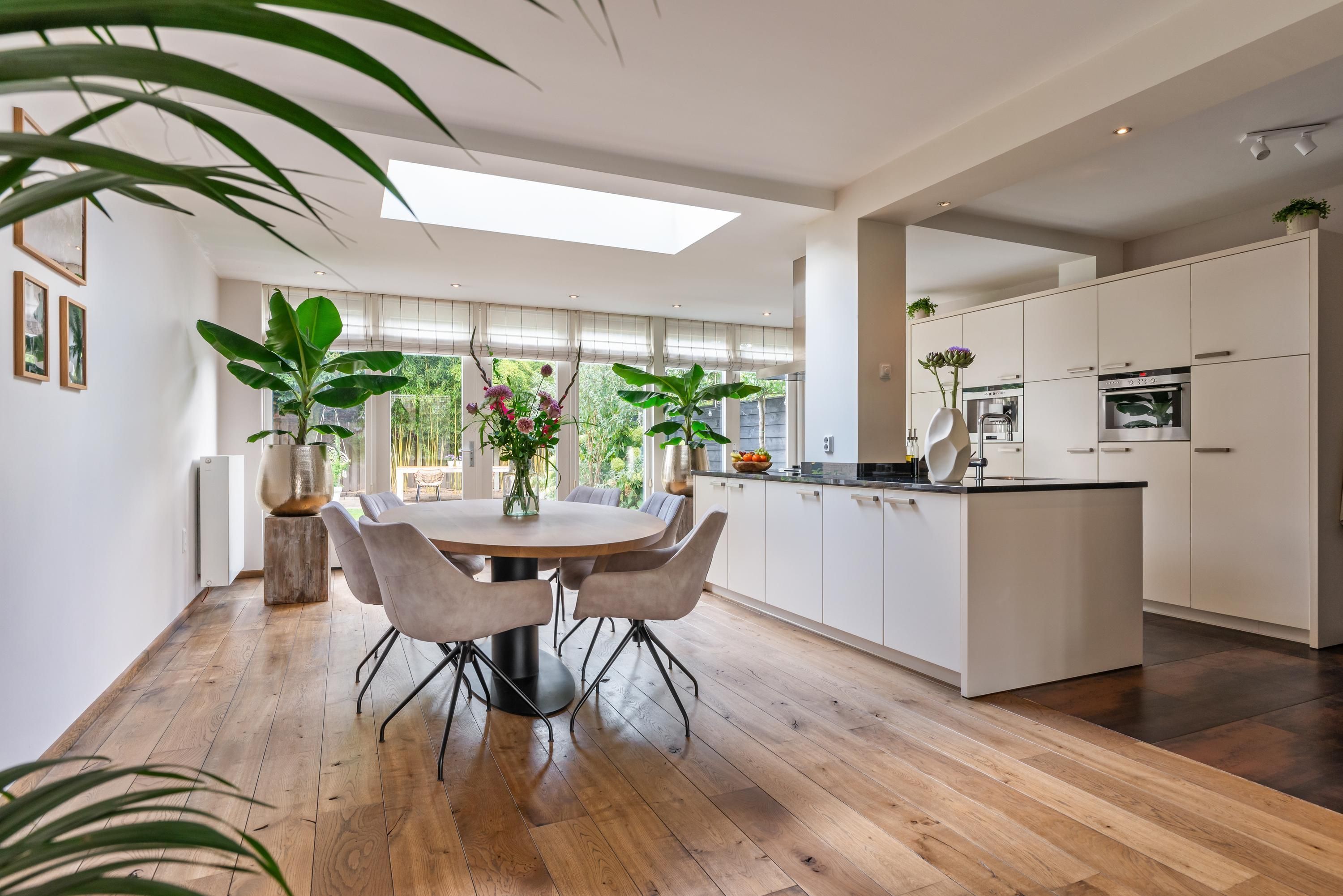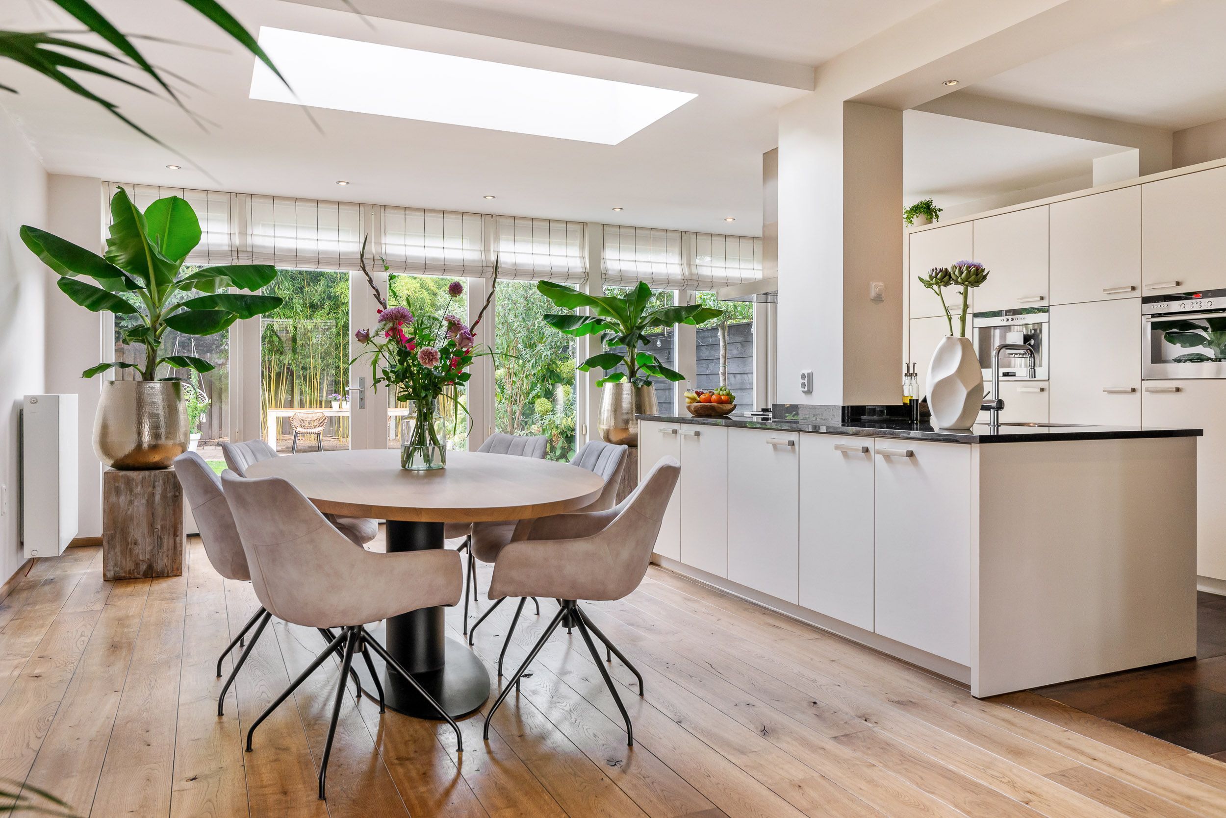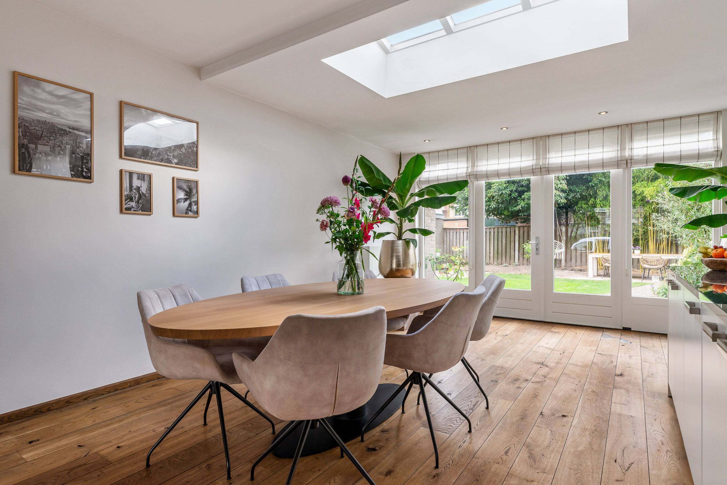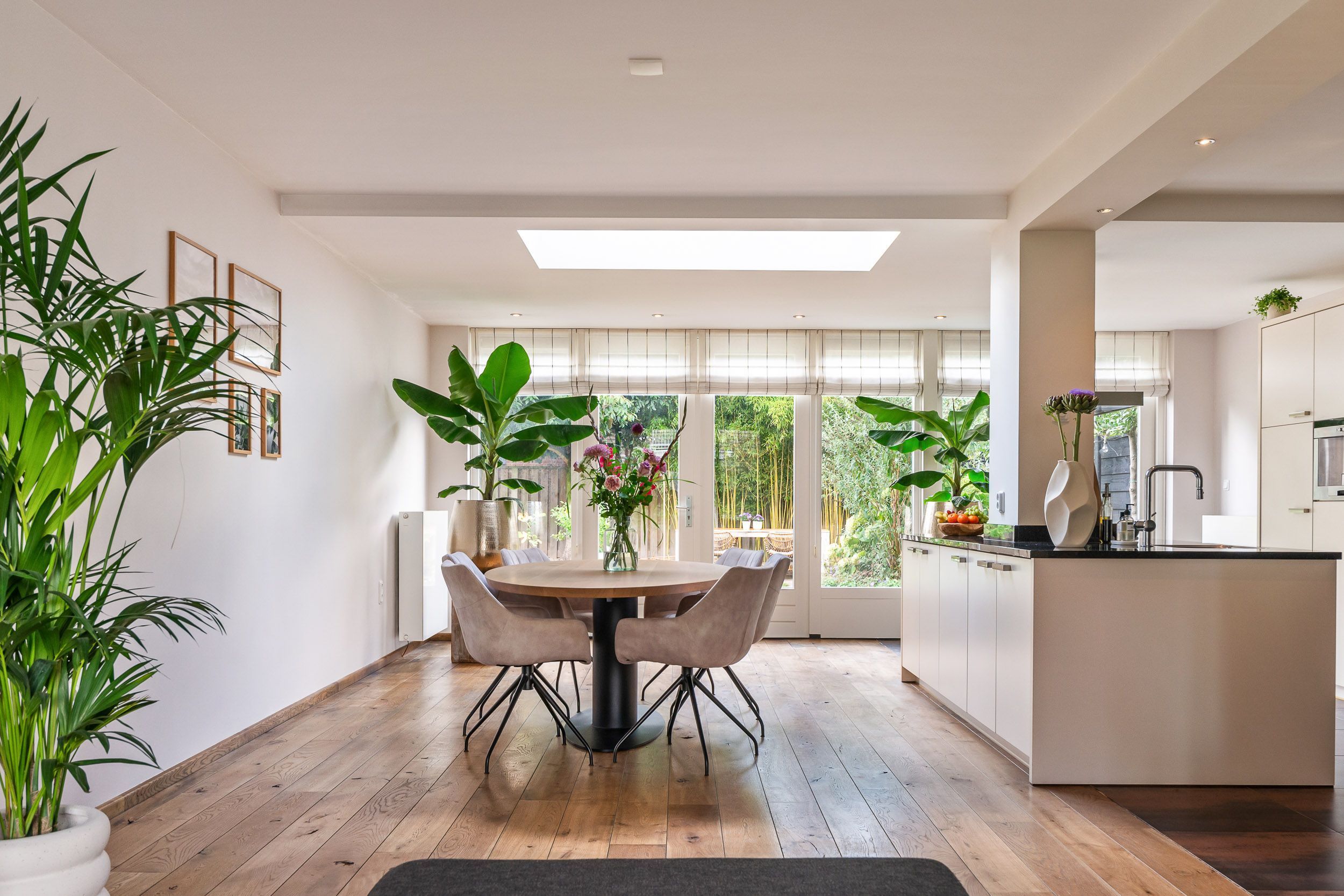 Dankzij de uitbouw met grote raampartijen en lichtstraat is het binnen heerlijk licht en ruimtelijk. De open leefkeuken en woonkamer sluiten naadloos op elkaar aan en bieden volop plek om samen te koken, eten en genieten.