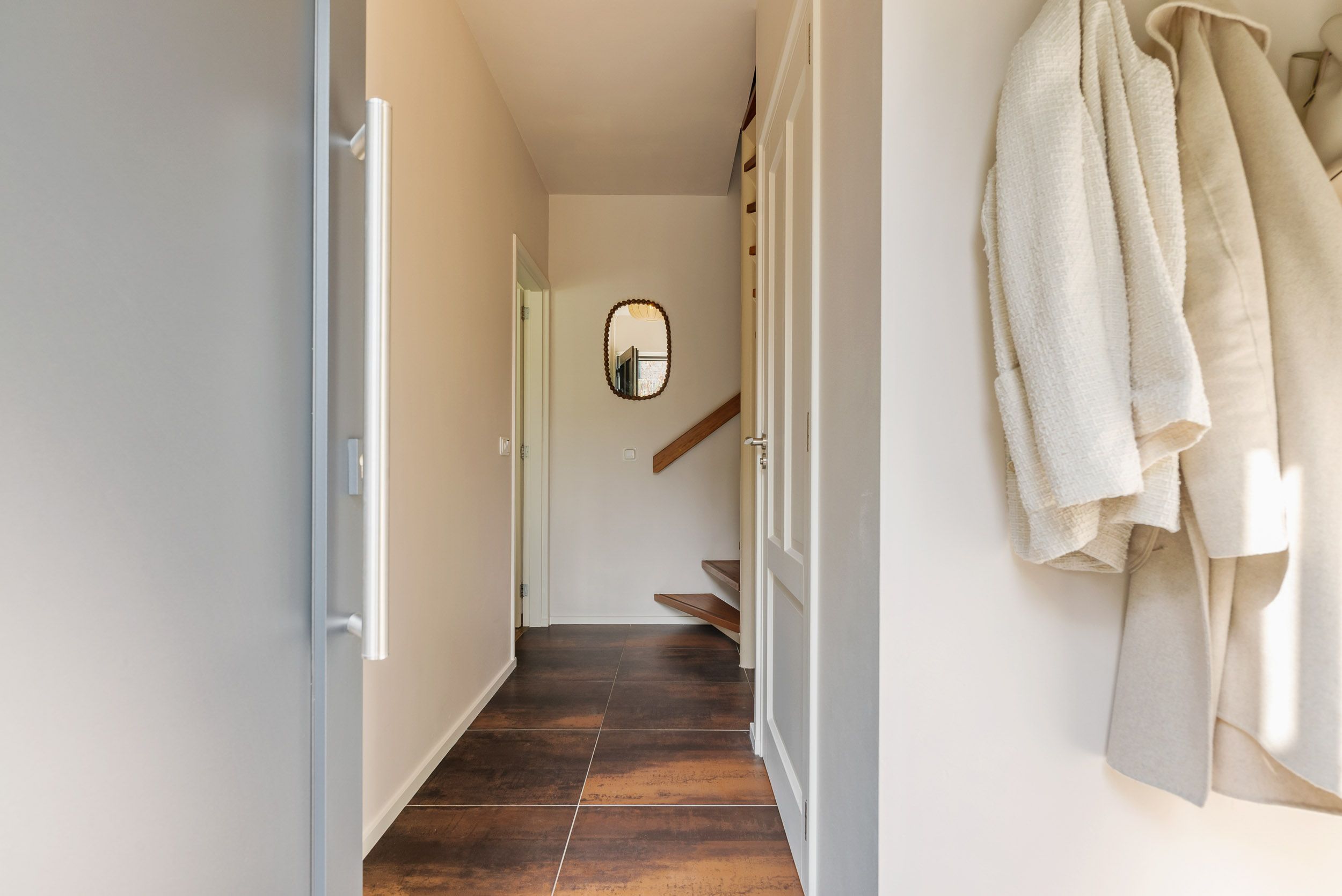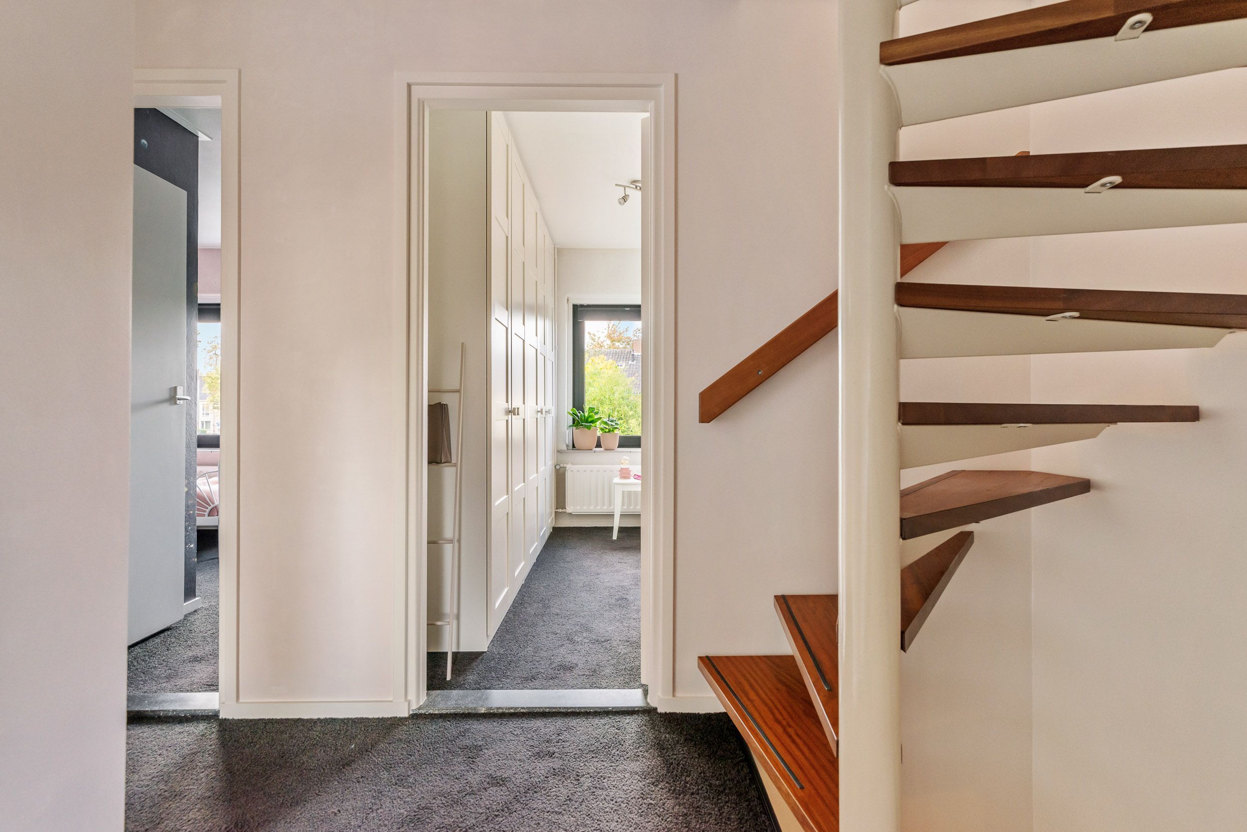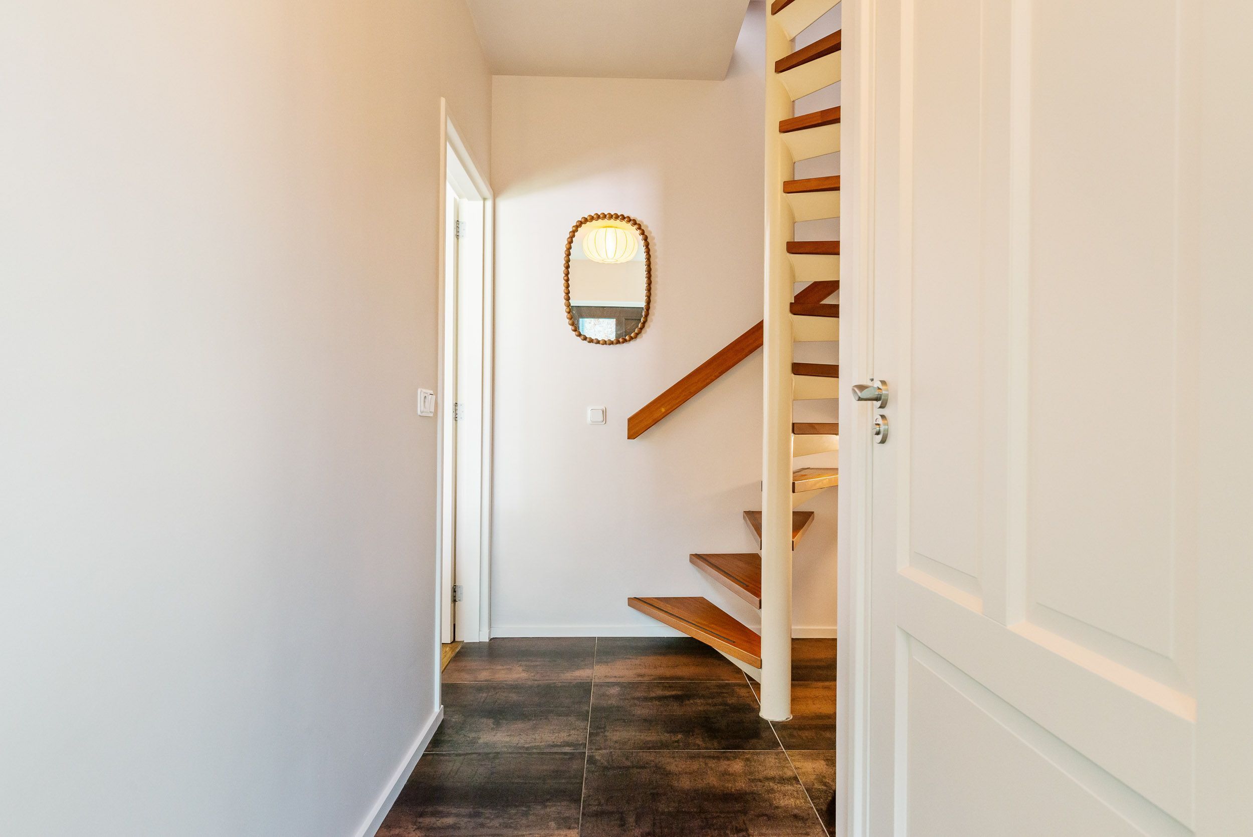 Kom gauw binnen. Je betreedt de woning via de aluminium voordeur met rookglas – stijlvol én goed voor de privacy. De betegelde hal met garderobe, toilet en een fraaie houten spiltrap leidt je naar de woonkamer.