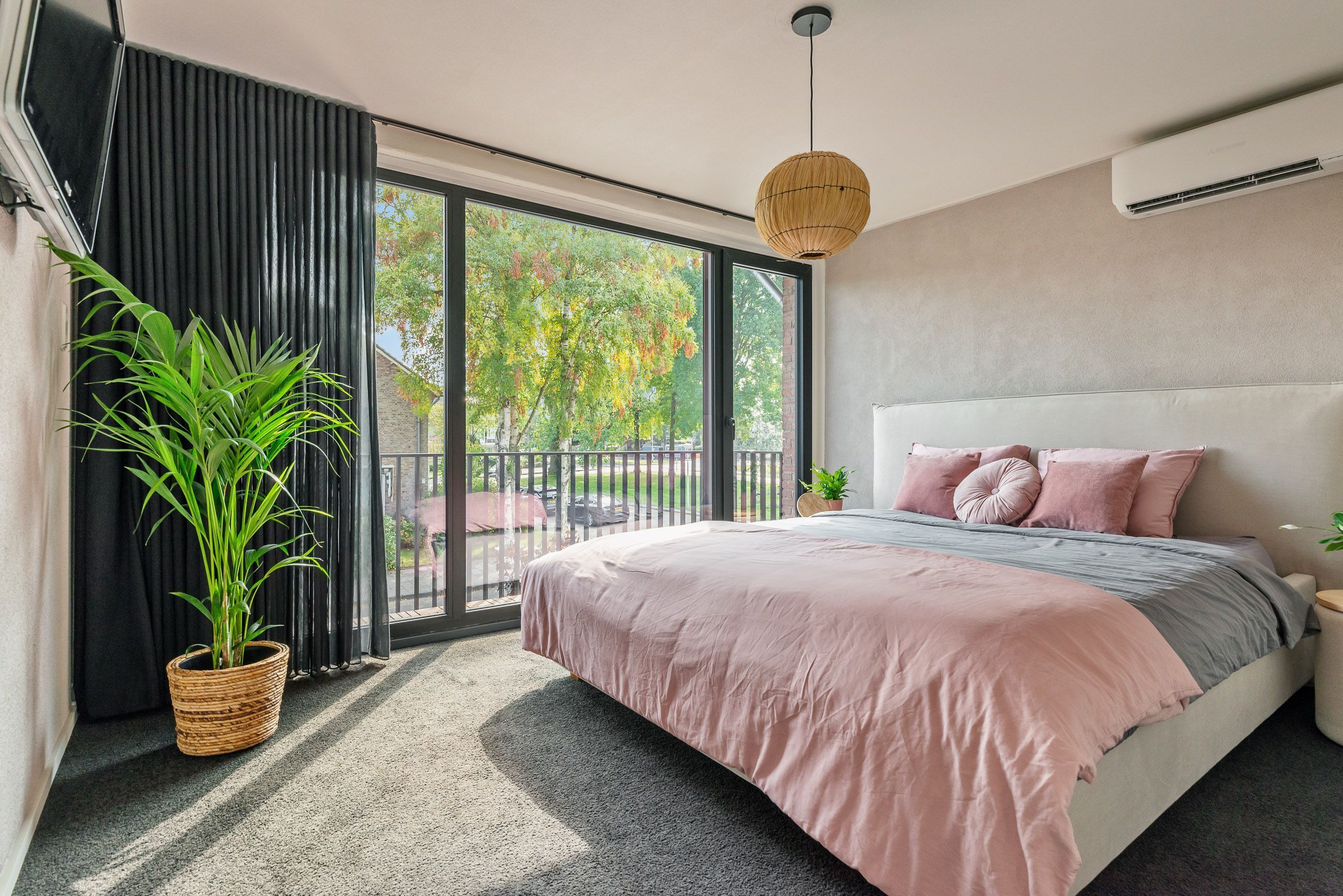Op de eerste verdieping ligt de hoofdslaapkamer, licht en open dankzij de grote raampartij over de volle breedte en hoogte. De donkere kozijnen geven een chique uitstraling en vanuit hier kijk je vrij uit richting de Dokter Berlagelaan. Aan deze kamer grenst een balkon met op maat gemaakt aluminium hekwerk en hardhouten vloerdelen: een fijn plekje aan de voorzijde.