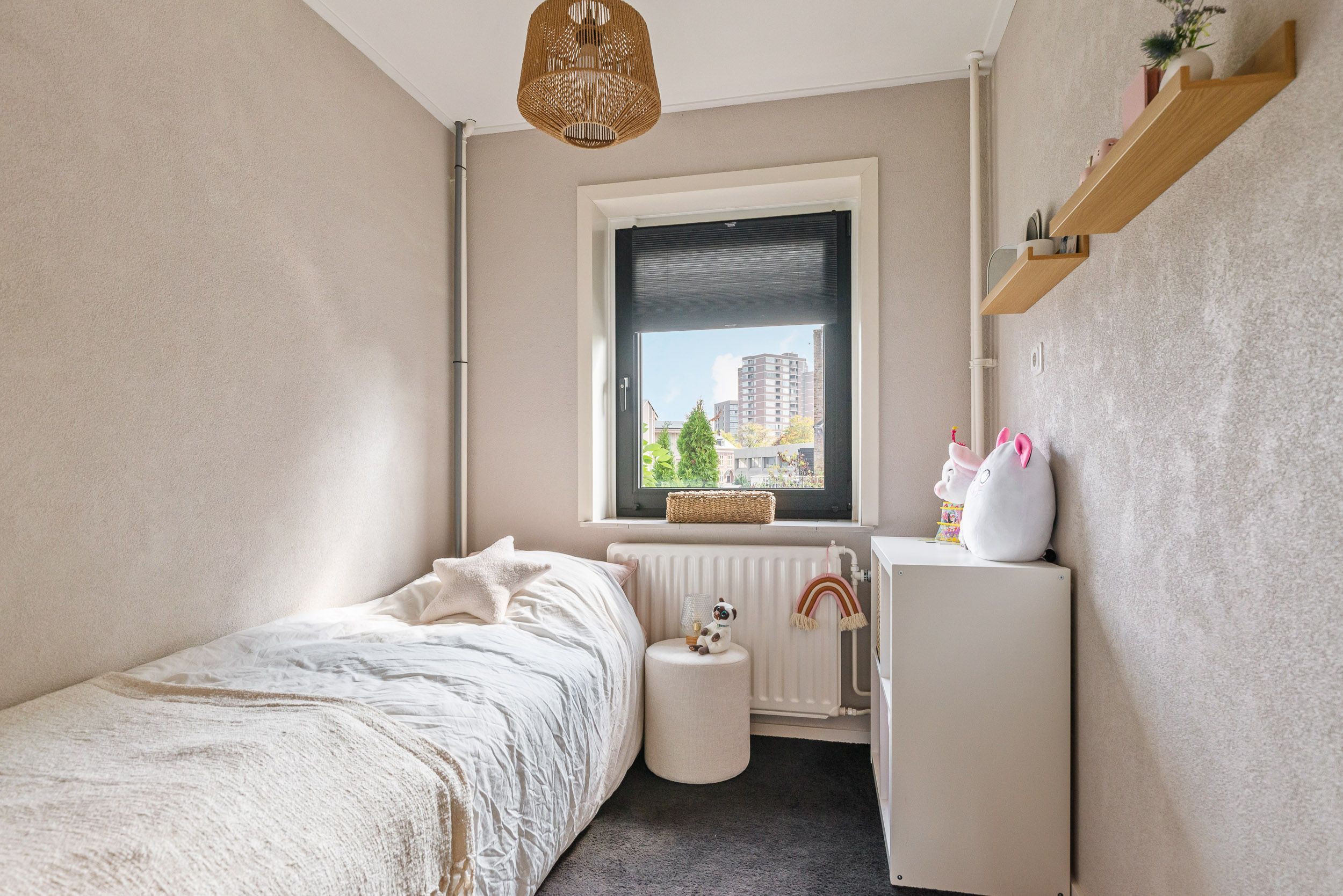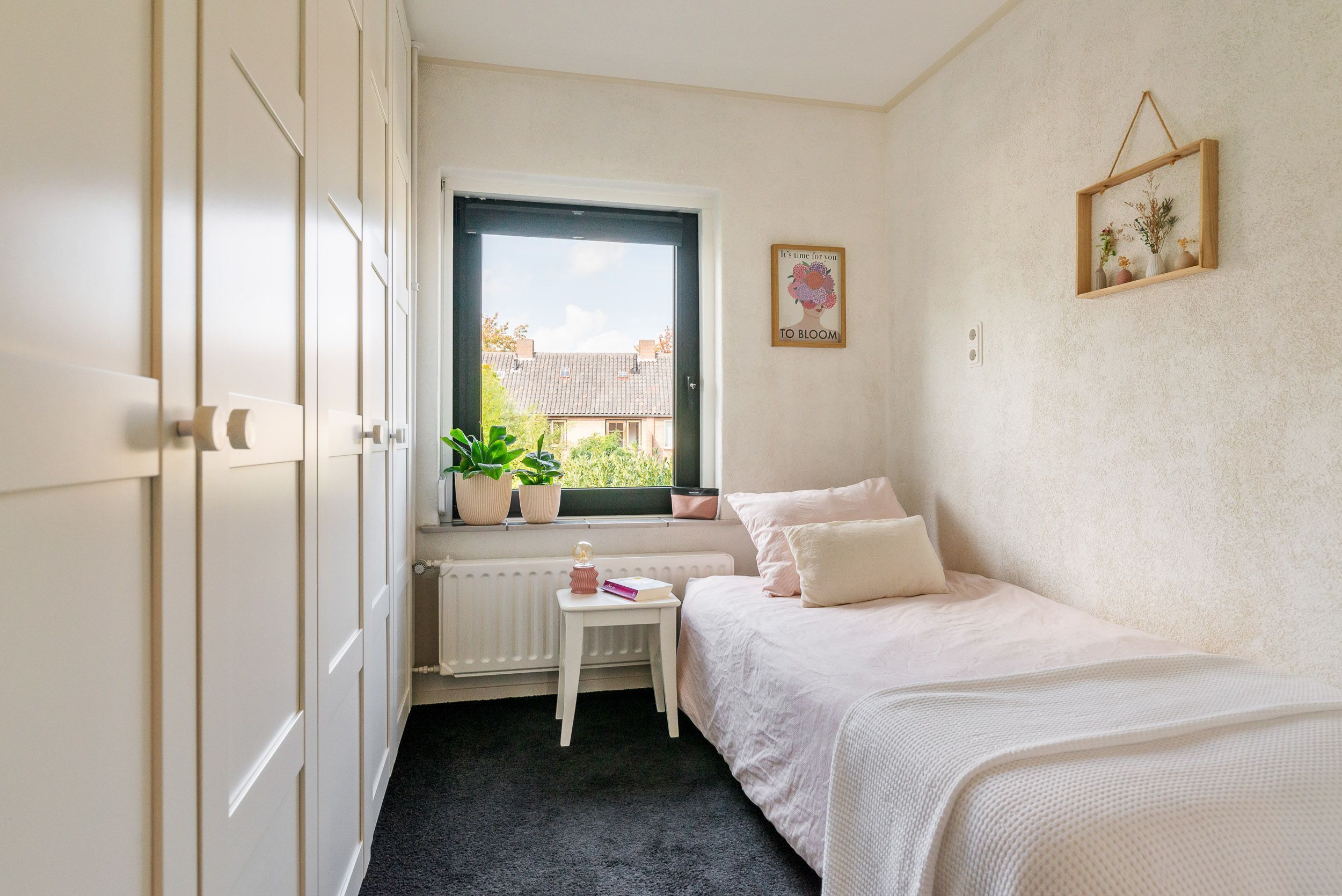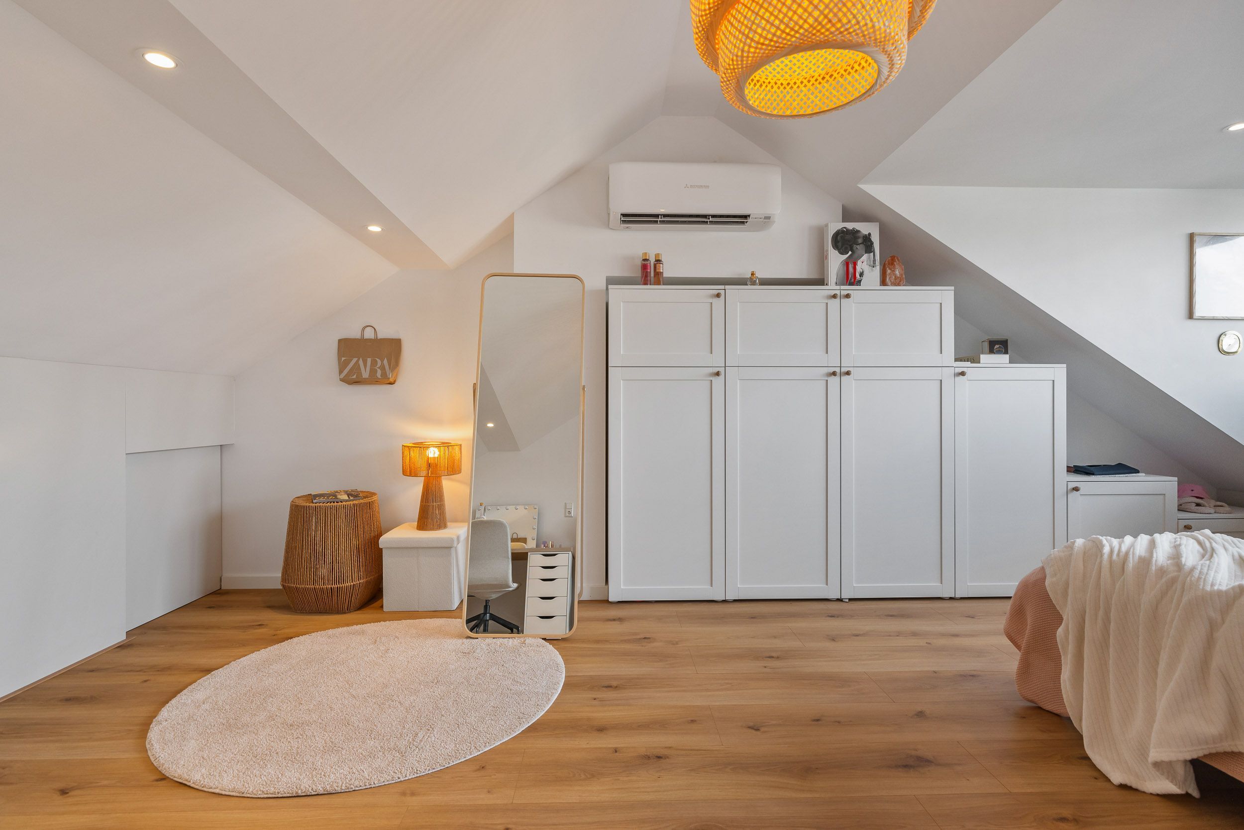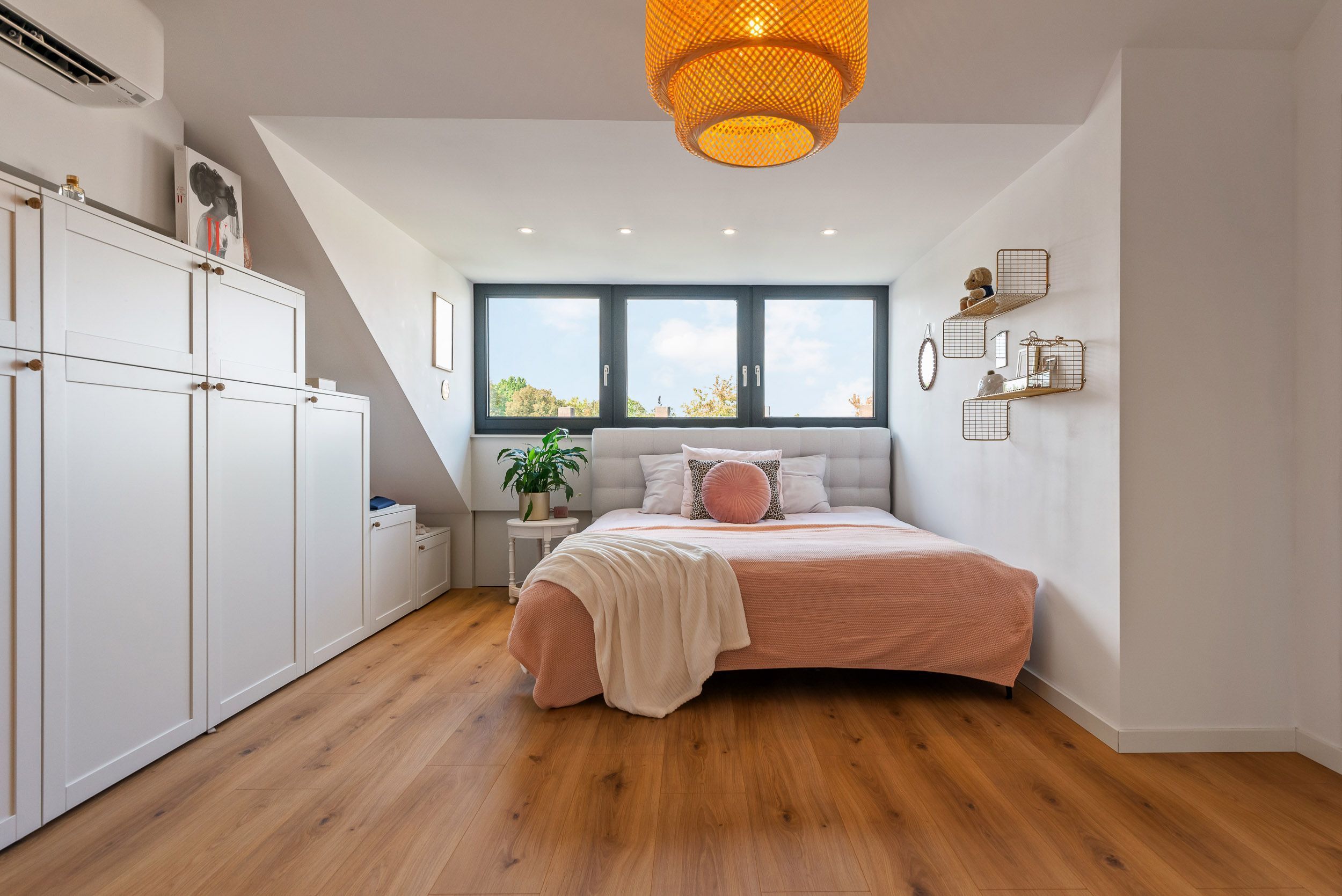 Op de tweede verdieping bevindt zich de vijfde kamer. Dankzij de brede dakkapel is dit een verrassend ruime en veelzijdige plek: slaapkamer, werkruimte, logeerkamer of hobbyruimte. Achter de schotten in de schuine wanden is volop bergruimte voor koffers, kerstspullen of speelgoed. Op de voorzolder/overloop vind je de aansluiting voor wasapparatuur en een lichte werkplek onder het raam. Heerlijk licht én rustig.
