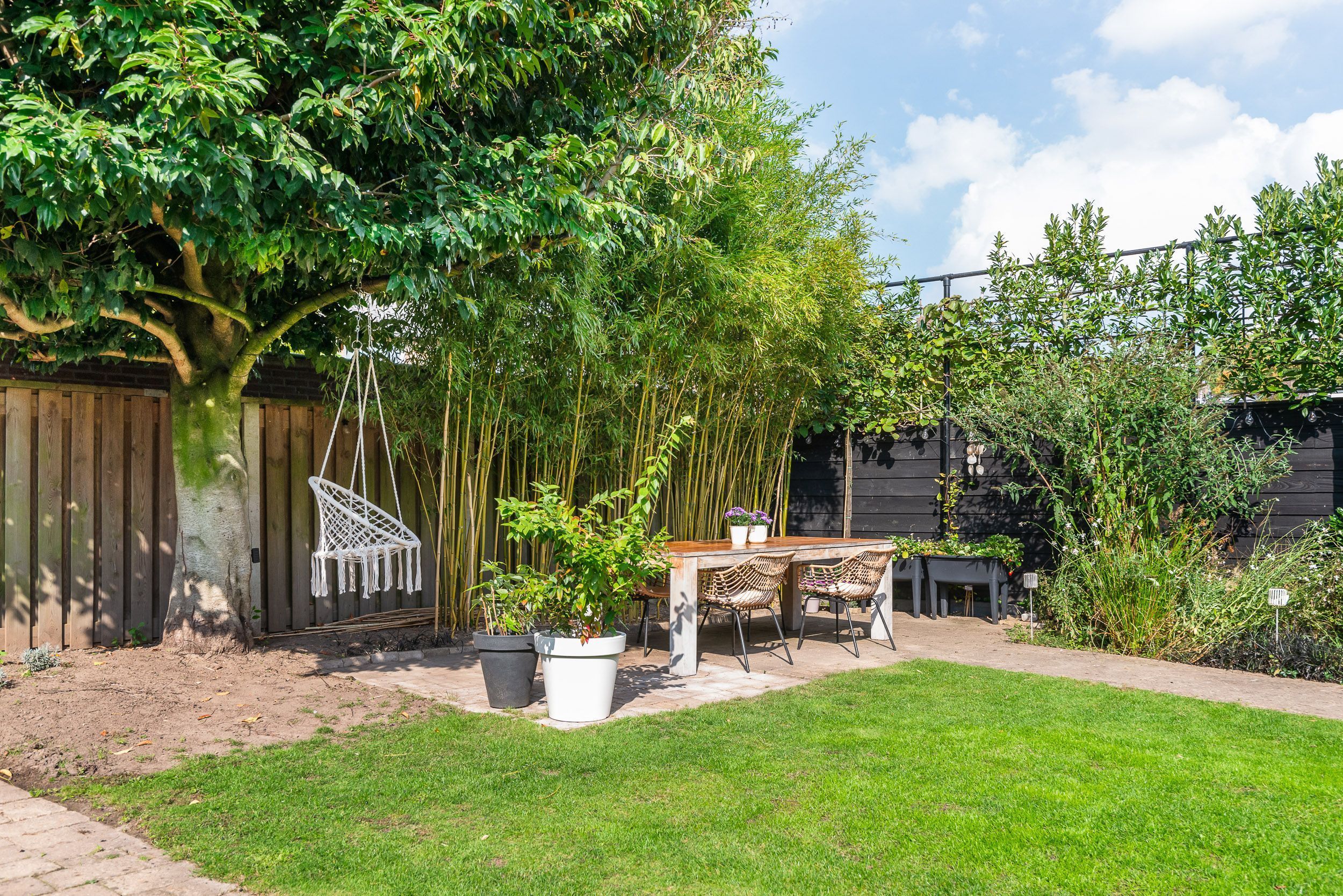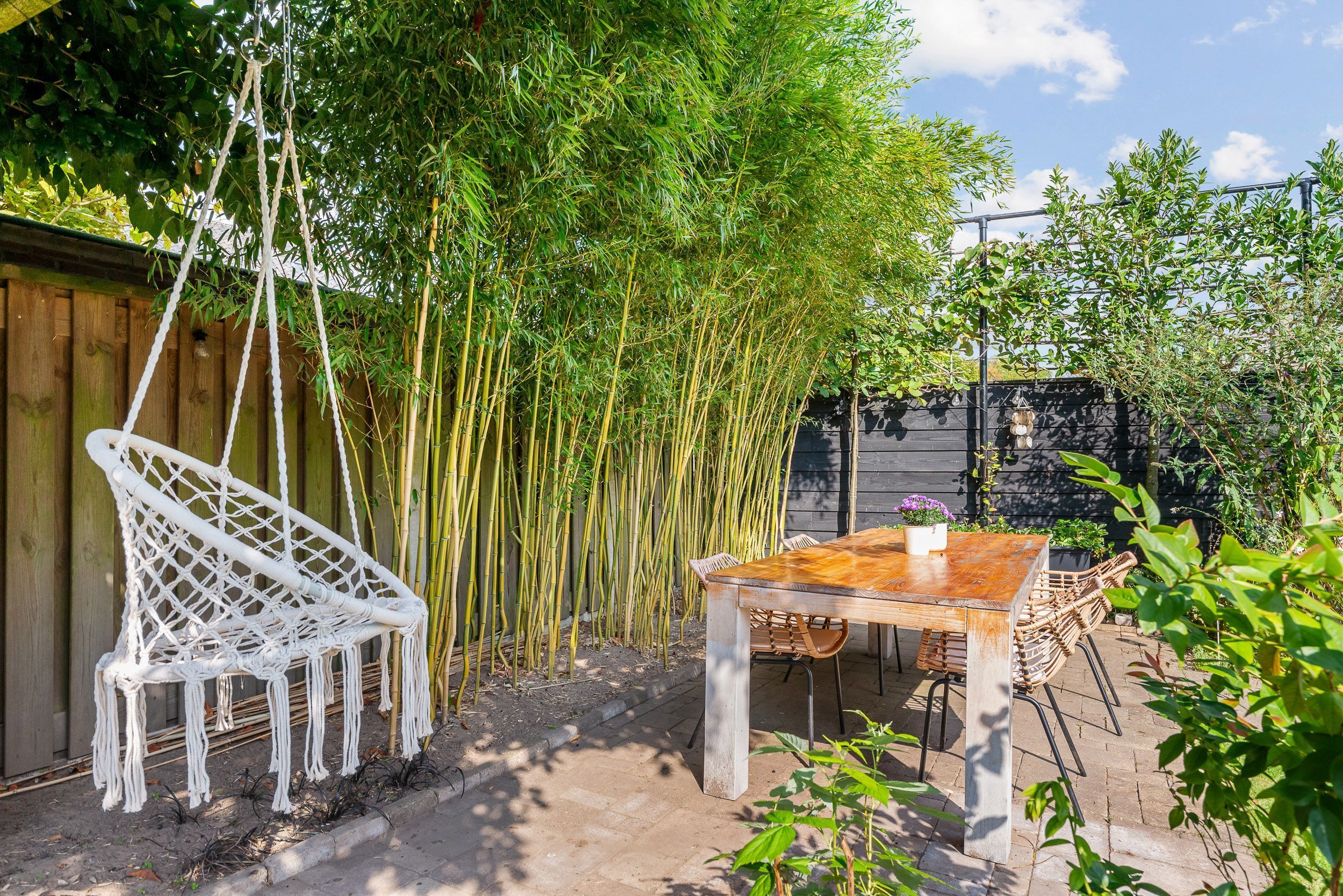 Terug naar beneden, richting achtertuin. Dit is een plek om écht te ontspannen. Open de deuren aan de achterzijde en geniet van de zon, die zich de hele dag op verschillende plekken laat zien. Of je nu ’s ochtends een kop koffie drinkt of ’s avonds nog wat zonnestralen meepakt: het kan hier allemaal. De leibomen zorgen voor privacy, terwijl laurier, bamboe, hortensia’s, vlinderstruik en passiebloem kleur en levendigheid brengen.