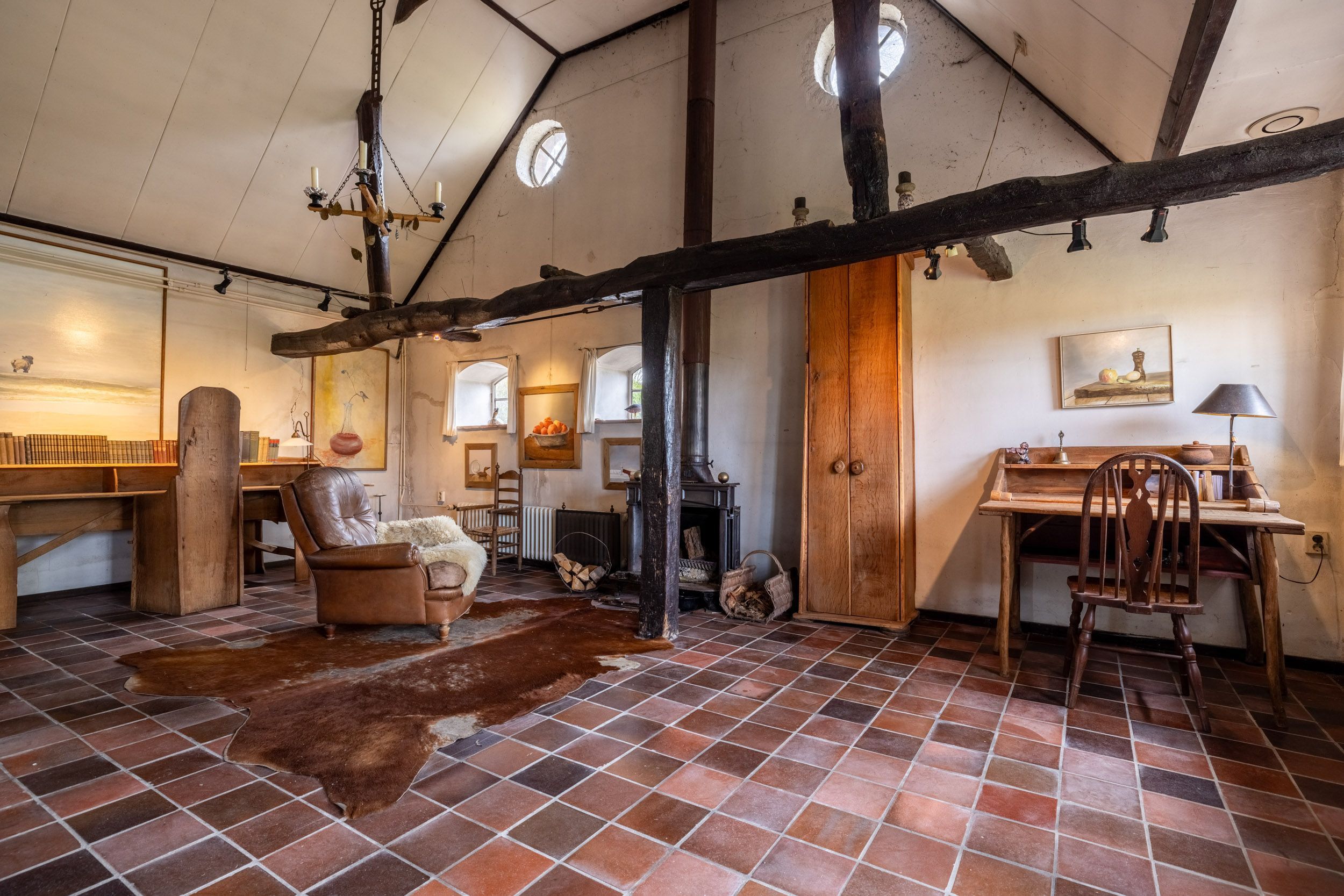 Het bijgebouw is volledig geïsoleerd en voorzien van elektra, een toilet en een houtkachel. Het atelier is een open en lichte ruimte met een bijzonder karakter en beschikt bovendien over een ruime, open zolderverdieping met open haard. Vanuit hier geniet je van een panoramisch uitzicht over de omliggende landerijen.