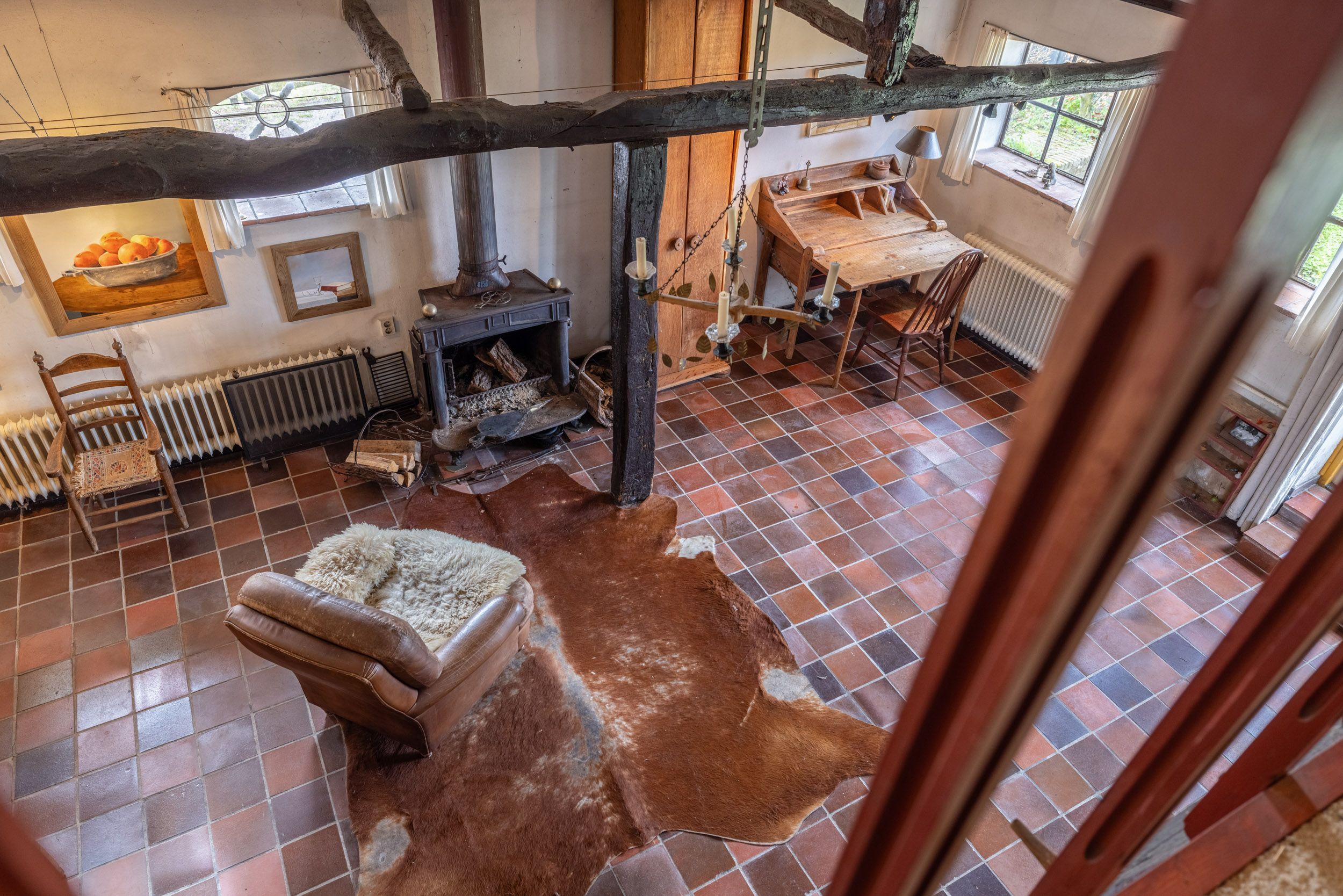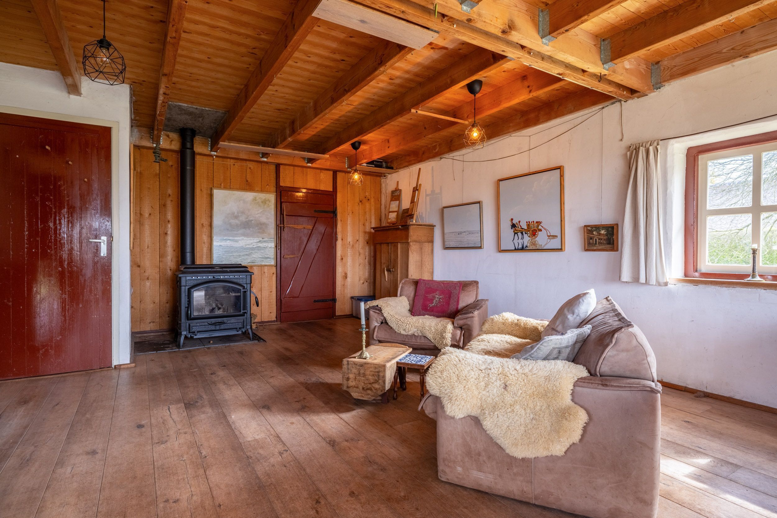 Aansluitend aan het voorhuis bevindt zich het voormalige stalgedeelte, dat momenteel in gebruik is als woonkamer. Hier ontvouwt zich een sfeervolle en bijzonder ruime eet-/woonkamer met plavuizenvloer, een vide tot in de nok en zichtbare houten constructiebalken. De karakteristieke stalraampjes zorgen voor een fraaie lichtinval, terwijl de houtkachel warmte en geborgenheid toevoegt. De hoogte, indeling en authentieke elementen maken dit tot een ruimte met karakter én potentie – een plek waar uiteenlopende woonwensen tot leven kunnen komen.