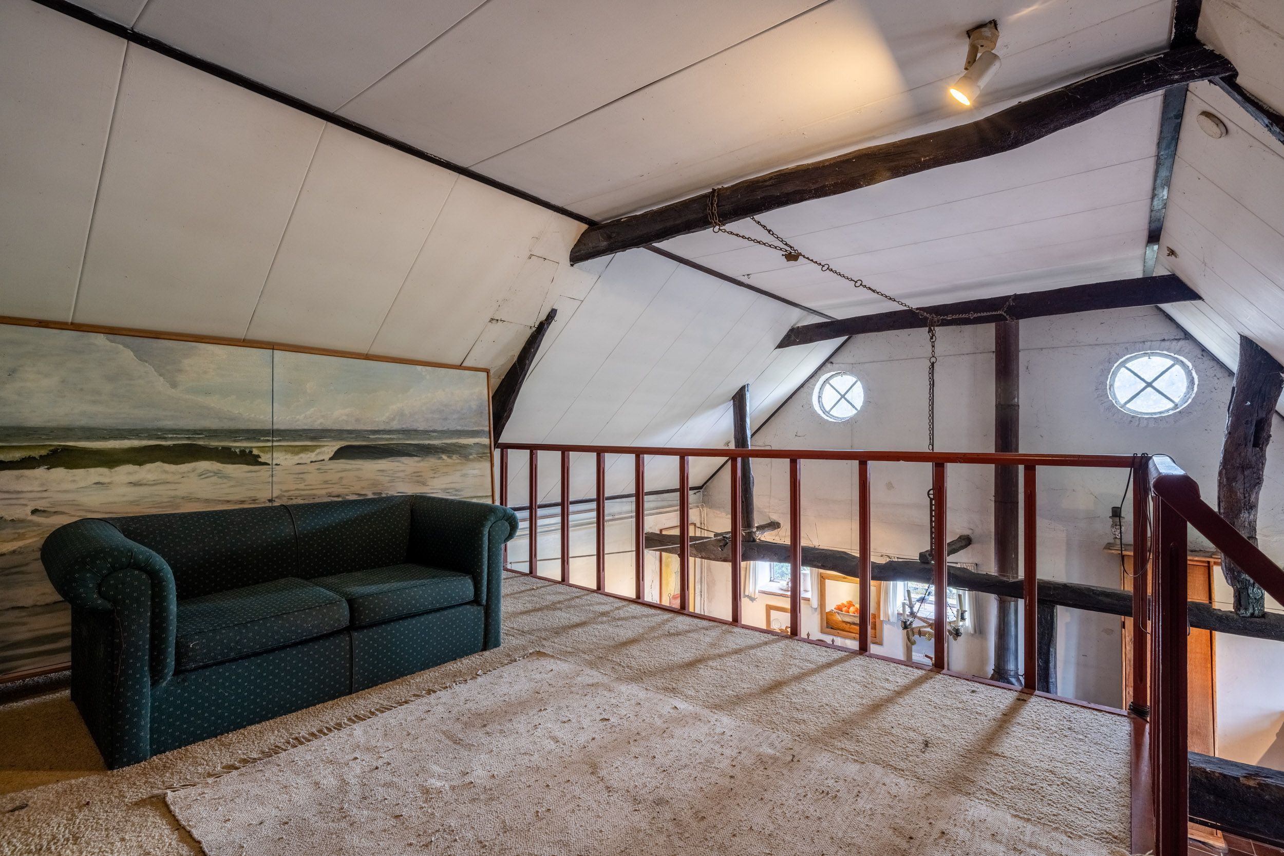De ruime bovenverdieping is bereikbaar via een vaste bordestrap en biedt eveneens volop mogelijkheden voor verdere invulling. Aan de lange overloop bevinden zich twee slaapkamers, meerdere bergruimtes, een technische ruimte met cv-combiketel en een compacte doucheruimte met wastafel. Ook hier biedt de aanwezige ruimte alle gelegenheid om het geheel naar eigen inzicht en woonwensen verder te optimaliseren.