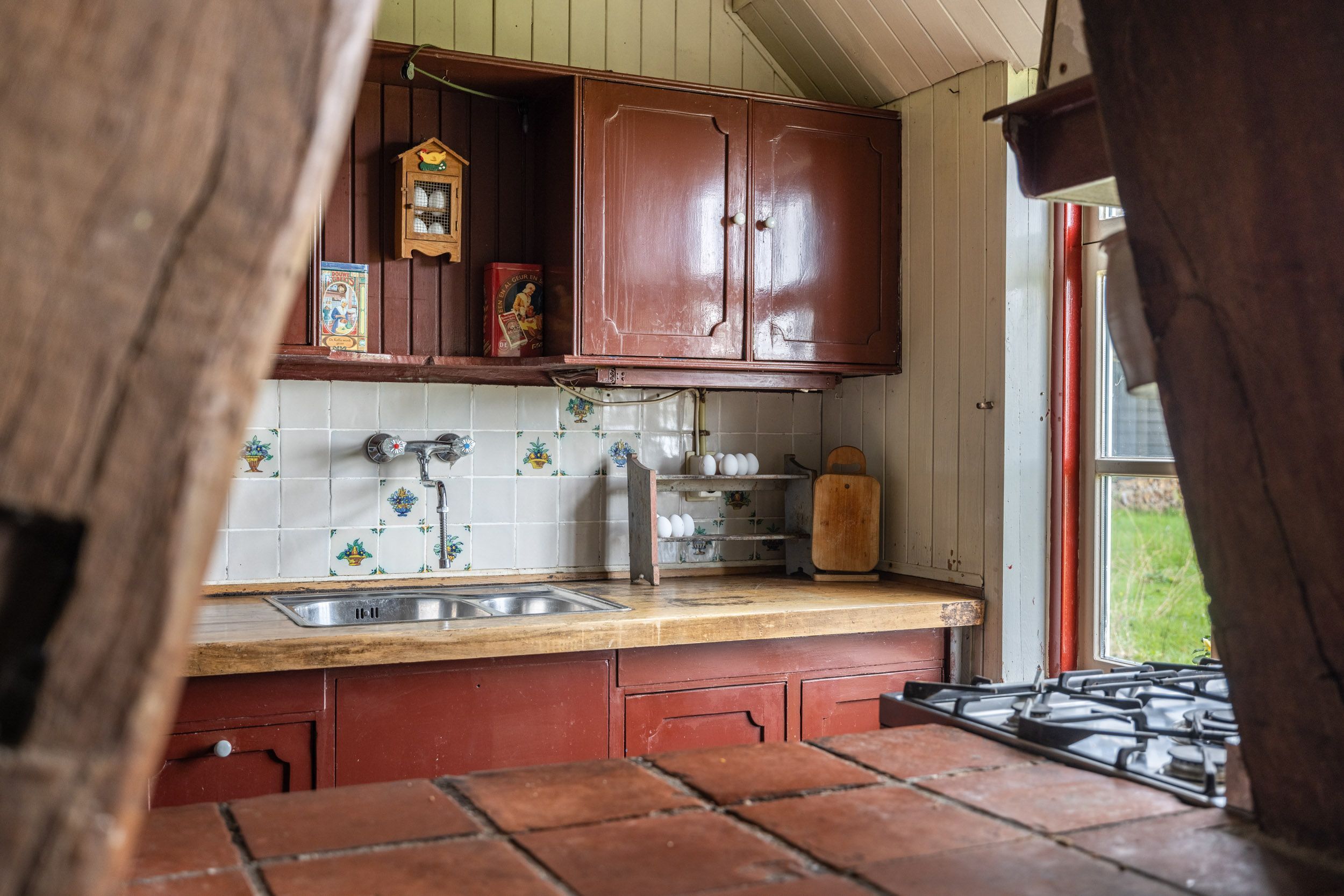Het voorhuis wordt in de praktijk betreden via de oprit aan de linkerzijde van de woning en de achtertuin, met toegang tot de keukenkamer met houtkachel. Hier ervaar je direct de sfeer en het karakter van deze langgevelboerderij. Authentieke elementen zijn volop aanwezig: van houten deuren met origineel beslag – kenmerkend voor de bouwperiode met een iets lagere doorloophoogte – tot stuc-op-riet plafonds en robuuste houtconstructies, die het geheel een warme en doorleefde uitstraling geven.