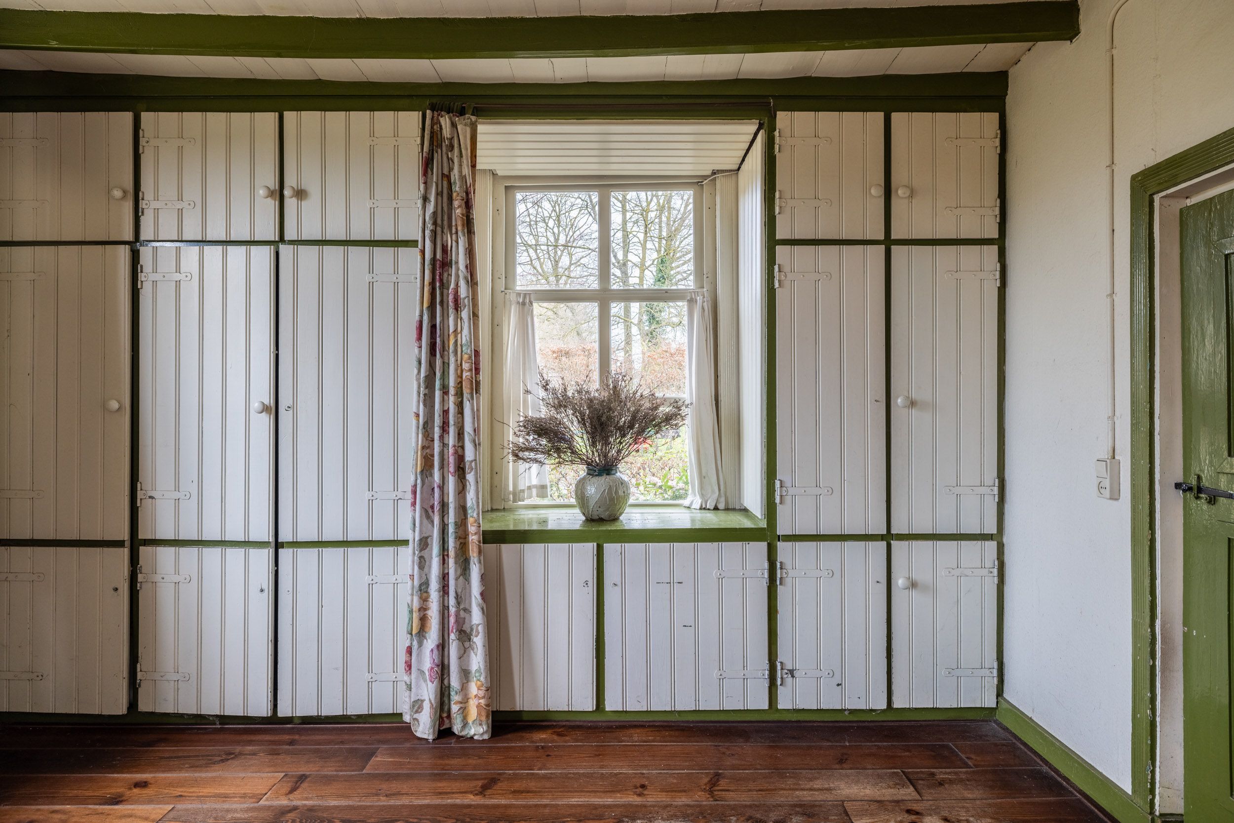 Aansluitend aan de keukenkamer bevindt zich de ontvangsthal. Vanuit hier bereik je de (slaap)kamer aan de voorzijde – de ‘goeikamer’ – voorzien van een vaste kastenwand. In de hal bevinden zich naast elkaar het toilet en een eenvoudige badkamer met douche en wastafel. Tevens is er een praktische opstelplaats voor de wasapparatuur in de bijkeuken naast de keuken.