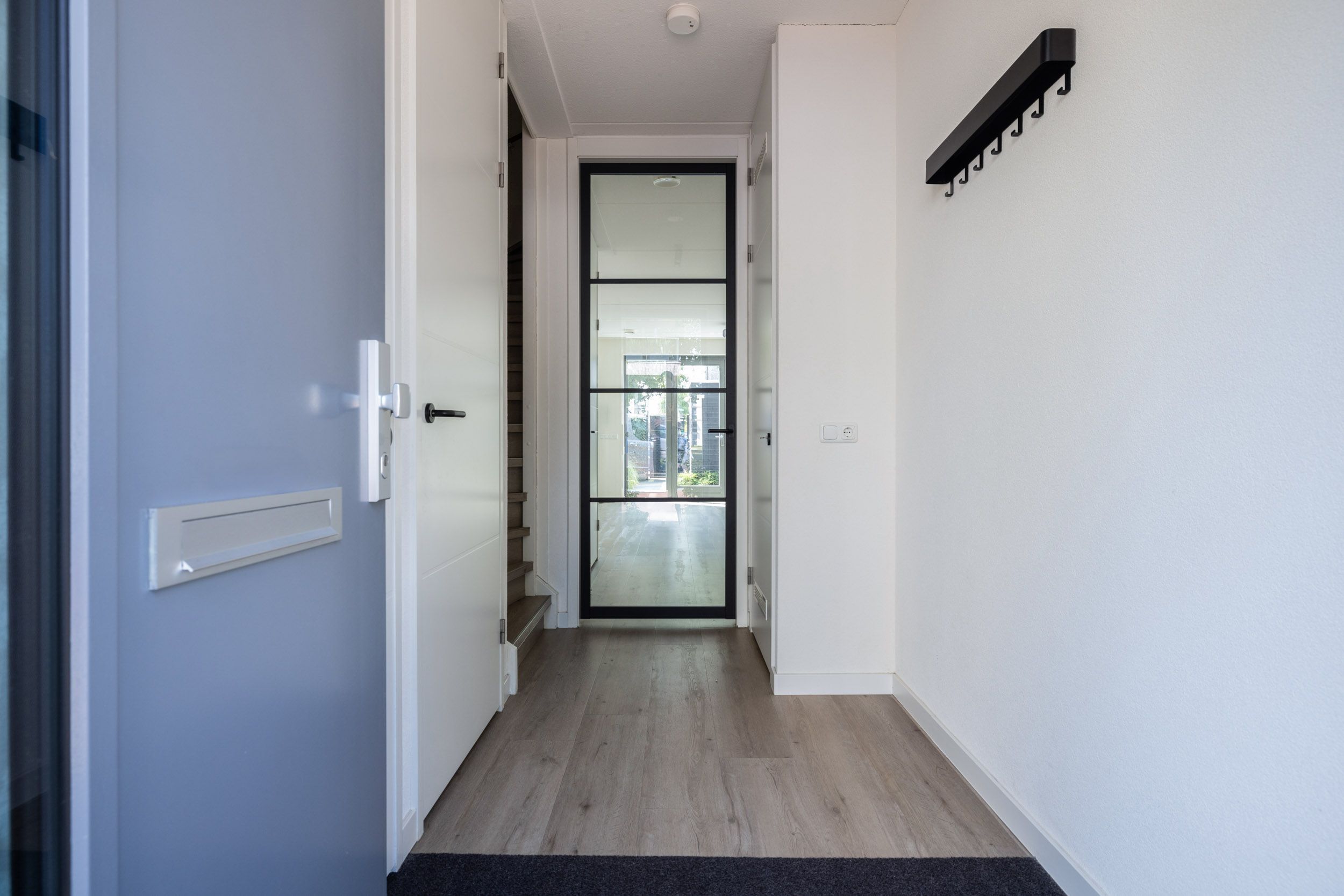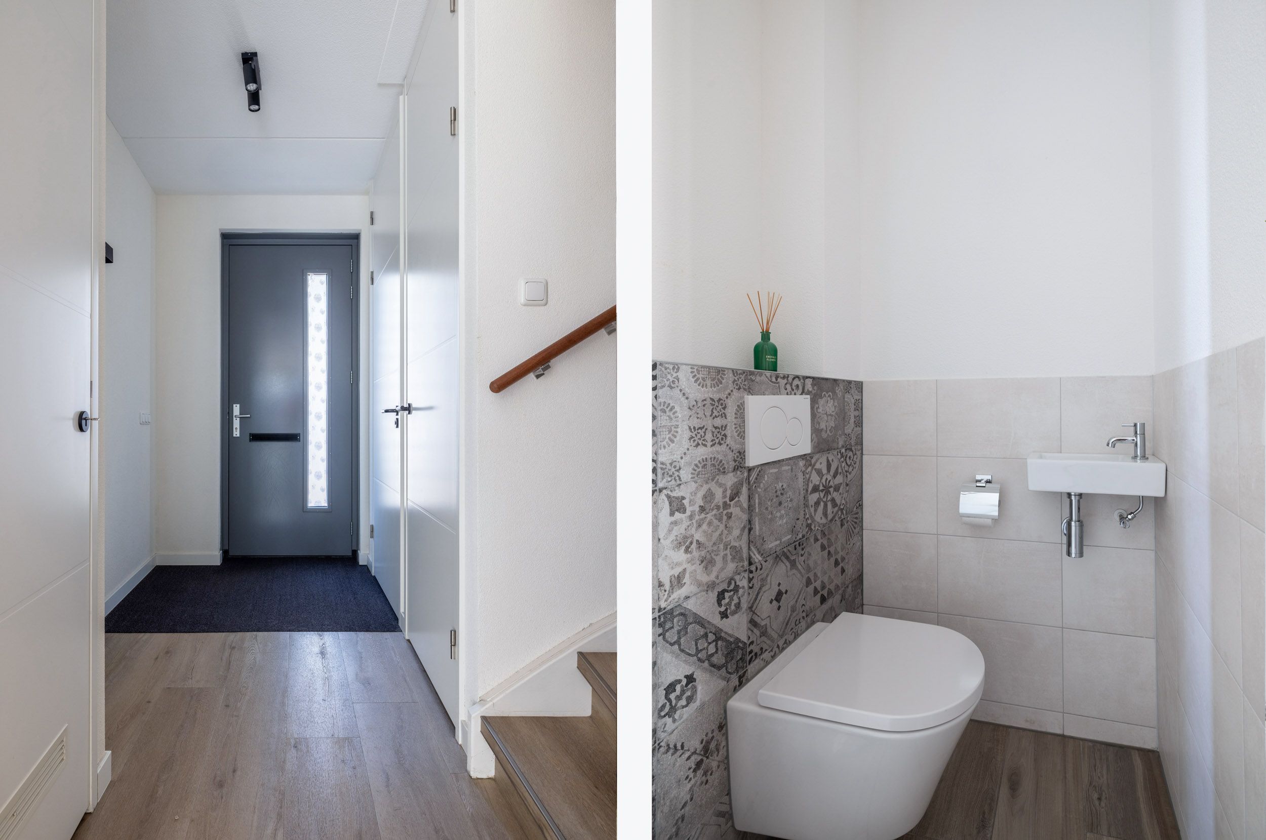 Via de overdekte entree, voorzien van een buitenkraan, komt u binnen in de ontvangsthal. Vanuit hier heeft u toegang tot de woonkamer via een stijlvolle binnendeur met glas, het moderne gastentoilet, de meterkast, de technische ruimte met warmtepomp en boilervat en de afgesloten trapopgang naar de eerste verdieping. Het toilet is halfhoog betegeld en voorzien van een vrijhangend closet en een fonteintje.