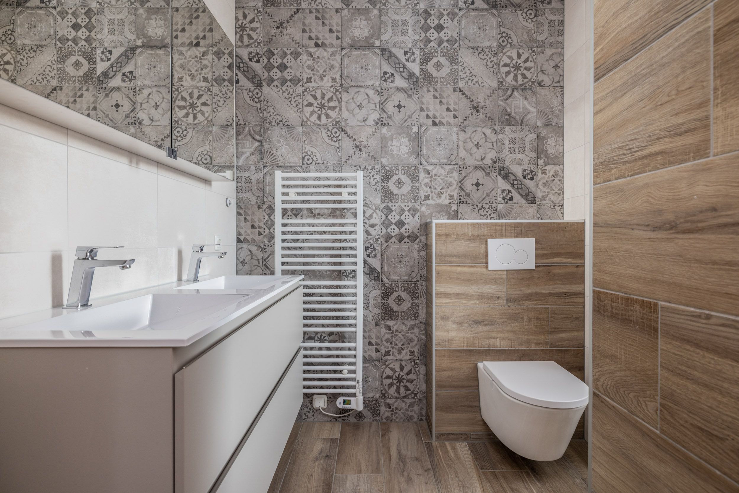 De luxe uitgevoerde badkamer is compleet ingericht met een inloopdouche voorzien van een thermostaatkraan, een dubbele wastafel met wandmeubel en een tweede, vrijhangend toilet. Daarnaast is de badkamer uitgerust met een elektrische handdoekradiator, mechanische ventilatie én natuurlijke ventilatie via het raam, wat zorgt voor een comfortabel en fris klimaat.