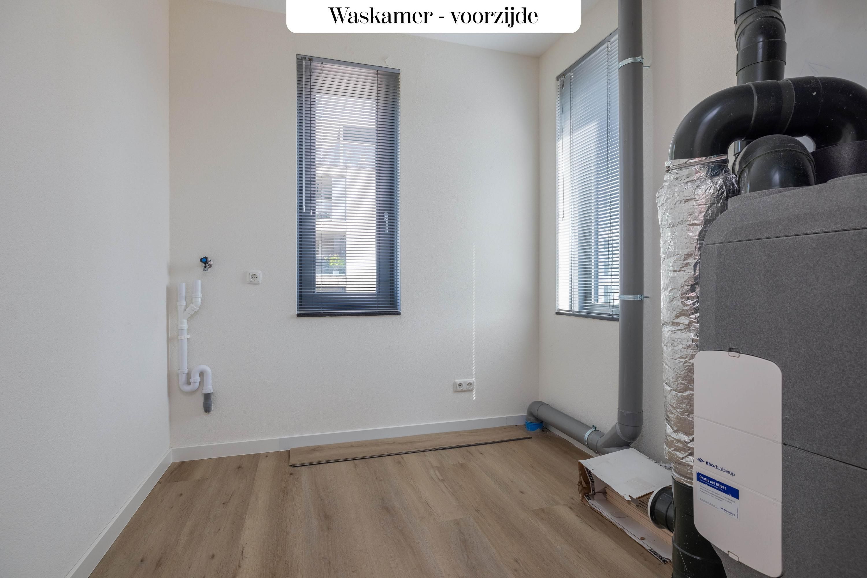 Aan de voorzijde bevindt zich tevens de waskamer, met aansluitingen voor wasmachine en droger en ruimte voor de opstelling van de warmte-terug-win-installatie.