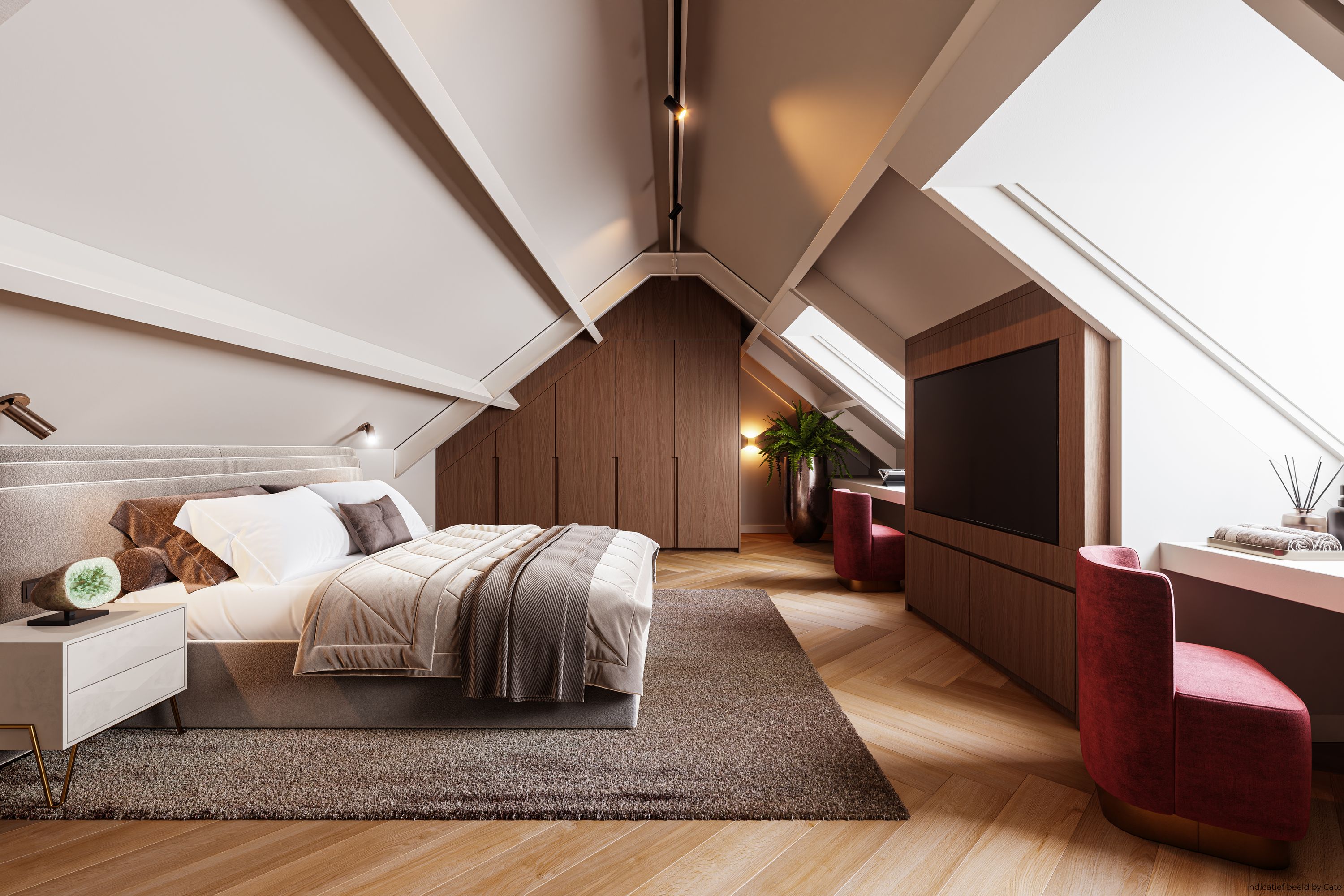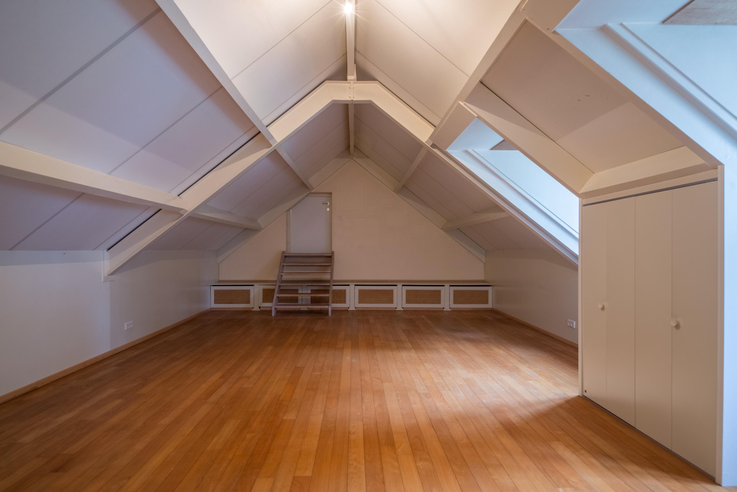 Royale oudersuite met kleedkamer, Frans balkon en luxe marmeren badkamer. Twee ruime slaapkamers met gedeelde badkamer. Geïsoleerde zolder (±170 m²) met veelzijdige gebruiksmogelijkheden.